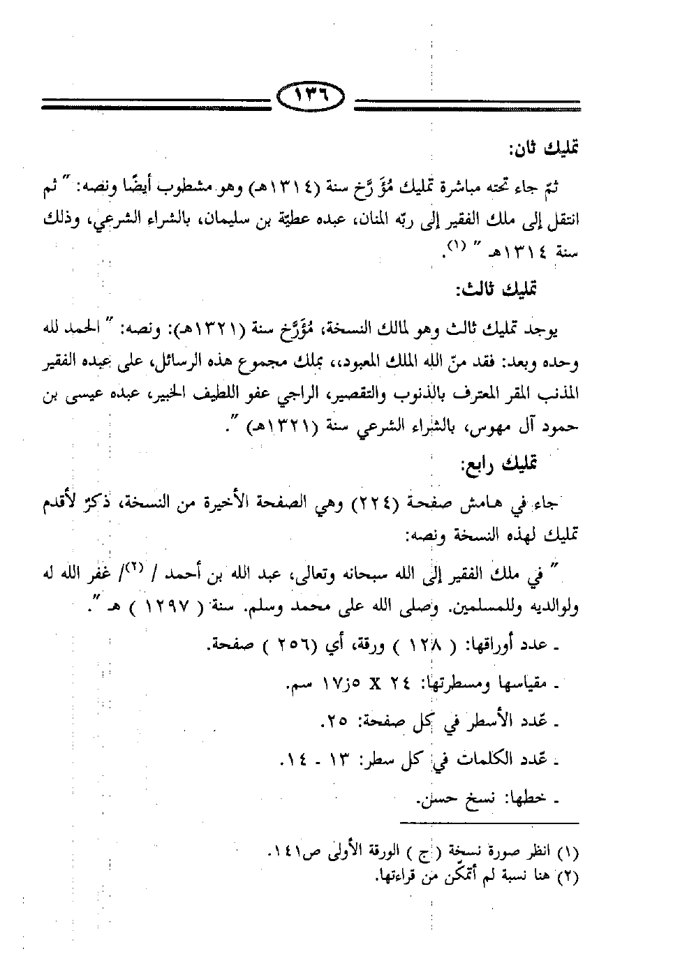 ثم جاء تحته مباشرة تمليك مؤرخ سنة (1314هـ) وهو مشطوب أيضاً ونصه: "ثم انتقل إلى ملك الفقير إلى ربه المنان، عبده عطية بن سليمان، بالشراء الشرعي، وذلك سنة 1314هـ" (1) .