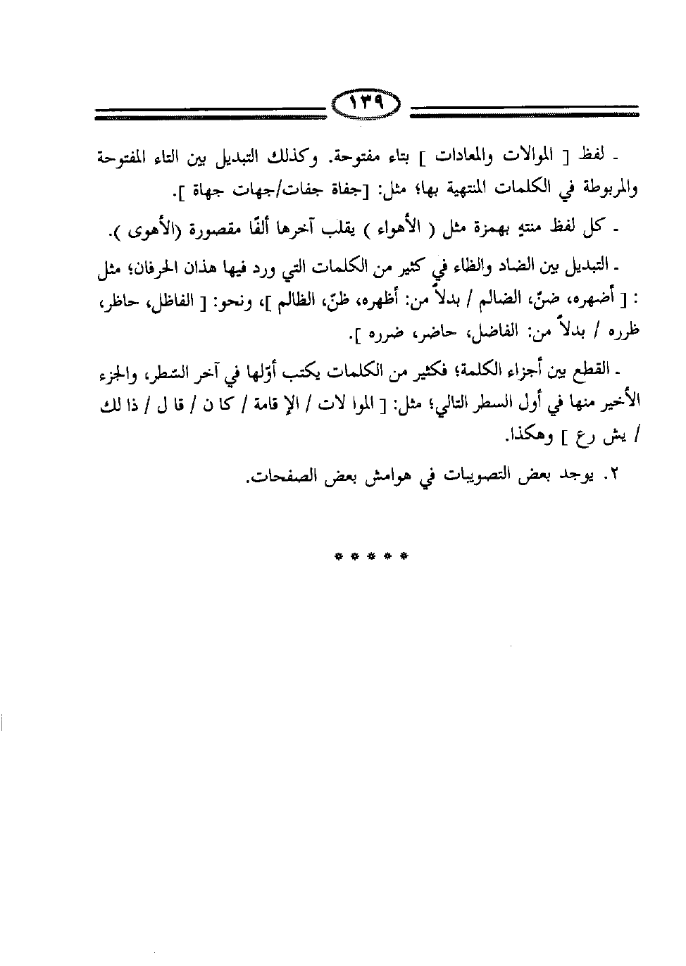 - لفظ [الموالات والمعادات] بتاء مفتوحة. وكذلك التبديل بين التاء المفتوحة والمربوطة في الكلمات المنتهية بها؛ مثل: [جفاة جفات/ جهات جهاة] .
