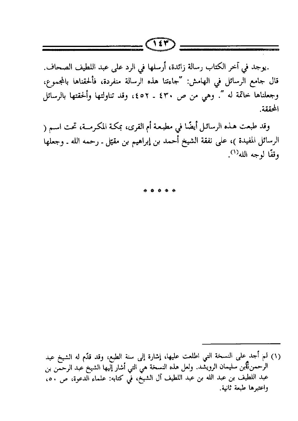 وقد طبعت هذه الرسائل أيضاً في مطبعة أم القرى، بمكة المكرمة، تحت اسم (الرسائل المفيدة) ، على نفقه الشيخ أحمد بن إبراهيم بن مقيّل -رحمه الله- وجعلها وقفاً لوجه الله (1) .