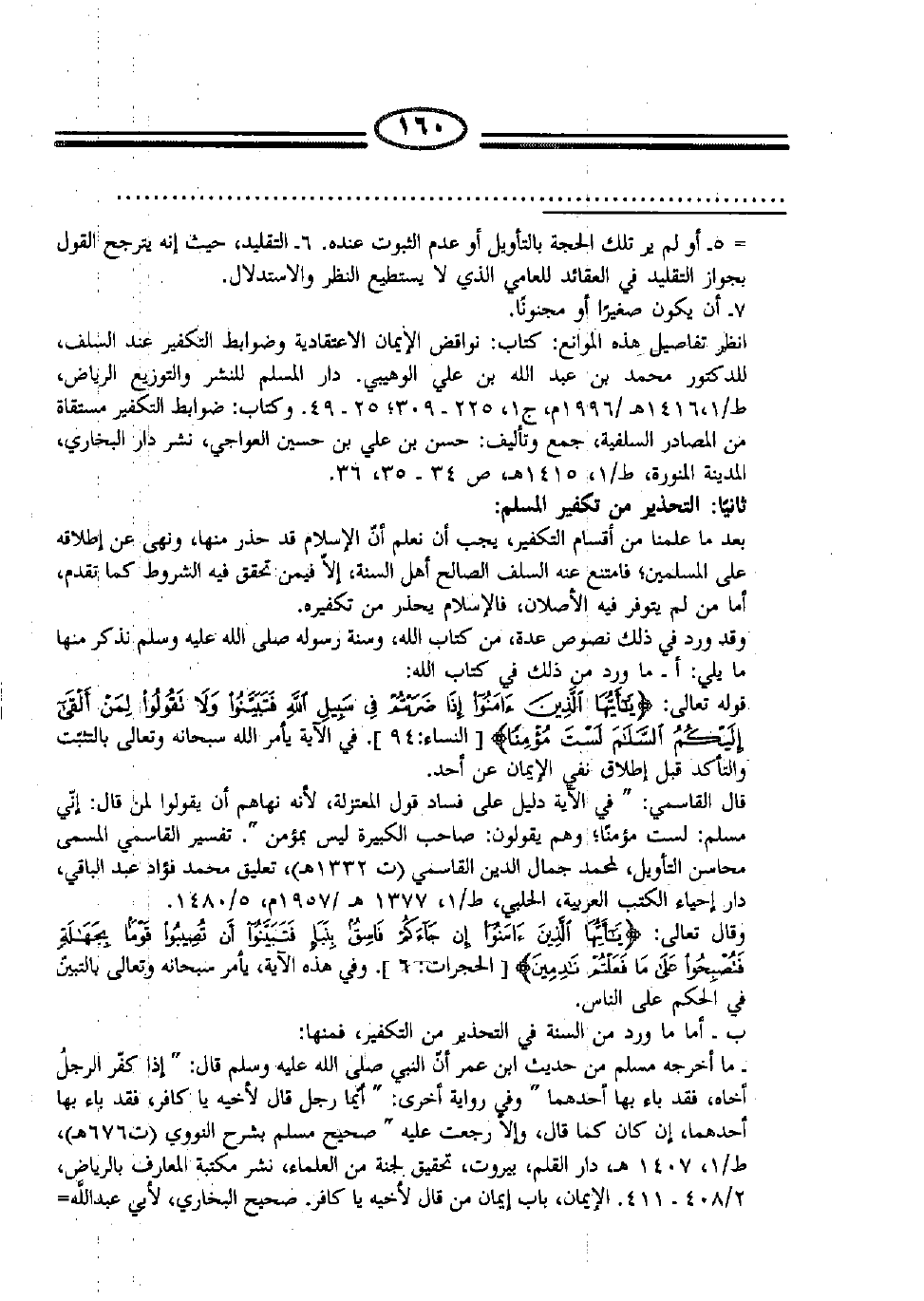 5. أو لم ير تلك الحجة بالتأويل أو عدم الثبوت عنده. 6- التقليد، حيث إنه يترجح القول بجواز التقليد في العقائد للعامي الذي لا يستطيع النظر والاستدلال.