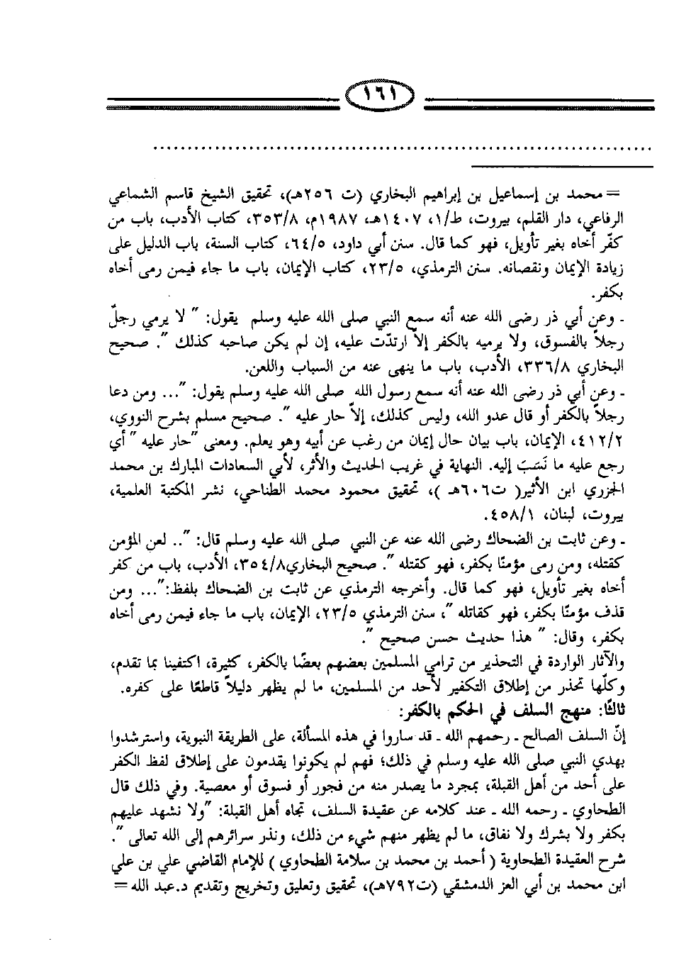 محمد بن إسماعيل بن إبراهيم البخاري (ت 256هـ) ، تحقيق الشيخ قاسم الشماعي الرفاعي، دار القلم، بيروت، ط/1، 1407هـ، 1987م، 8/353، كتاب الأدب، باب من كفر أخاه بغير تأويل، فهو كما قال. سنن أبي داود، 5/64، كتاب السنة، باب الدليل على زيادة الإيمان ونقصانه. سنن الترمذي، 5/23، كتاب الإيمان، باب ما جاء فيمن رمى أخاه بكفر.
