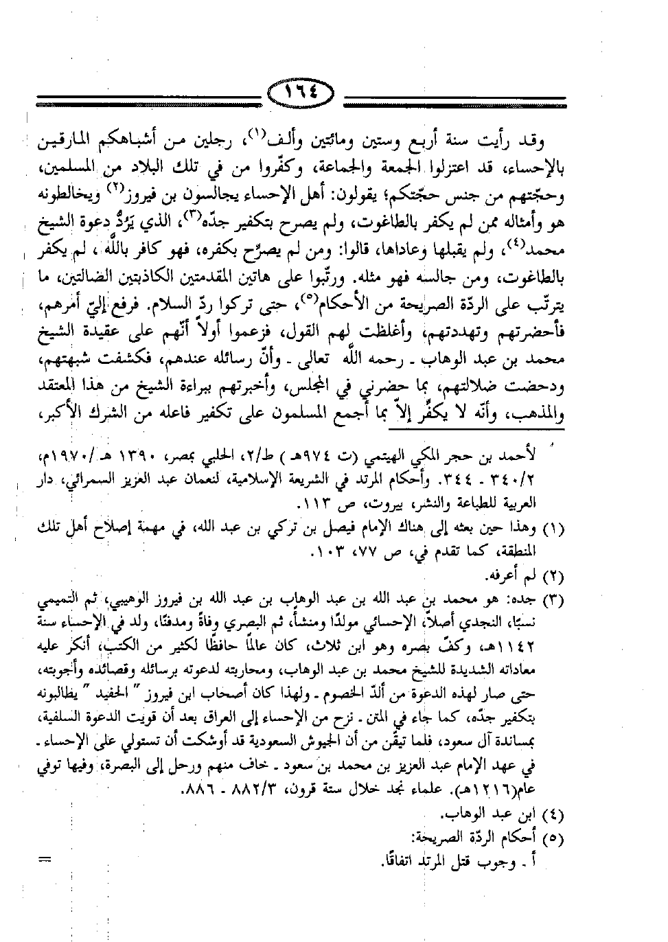 وقد رأيت سنة أربع وستين ومائتين وألف (1) ، رجلين من أشباهكم المارقين بالإحساء، قد اعتزلوا الجمعة والجماعة، وكفروا من في تلك البلاد من المسلمين، وحجتهم من جنس حجتكم؛ يقولون: أهل الإحساء يجالسون بن فيروز (2) ويخالطونه هو وأمثاله ممن لم يكفر بالطاغوت، ولم يصرح بتكفير جده (3) ، الذي يرد دعوة الشيخ محمد (4) ، ولم يقبلها وعاداها، قالوا: ومن لم يصرح بكفره، فهو كافر بالله، لم يكفر بالطاغوت، ومن جالسه فهو مثله. ورتبوا على هاتين المقدمتين الكاذبتين الضالتين، ما يترتب على الردة الصريحة من الأحكام (5) ، حتى تركوا رد السلام. فرفع إليّ أمرهم، فأحضرتهم وتهددتهم، وأغلظت لهم القول، فزعموا أولاً أنهم على عقيدة الشيخ محمد بن عبد الوهاب -رحمه الله تعالى- وأن رسائله عندهم، فكشفت شبهتهم، ودحضت ضلالتهم، بما حضرني في المجلس، وأخبرتهم ببراءة الشيخ من هذا المعتقد والمذهب، وأنه لا يكفر إلا بما أجمع المسلمون على تكفير فاعله من الشرك الأكبر،