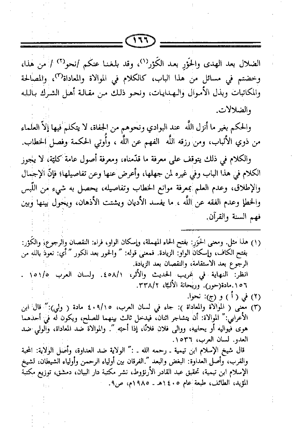 (3) معنى (الموالاة والمعاداة) جاء في لسان العرب، 15/409 مادة (ولي) : "قال ابن هوى فيواليه أو يحابيه، ووالى فلان فلاناً، إذا أحبه. والموالاة ضد المعاداة، والولي ضد العدو. لسان العربي، 1536.