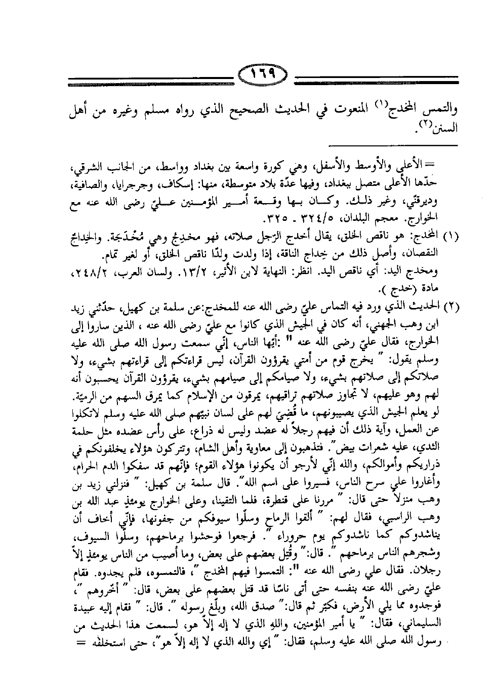 (2) الحديث الذي ورد فيه التماس علي رضي الله عنه للمخدج: عن سلمة بن كهيل، حدثني زيد بن وهب الجهني، أنه كان في الجيش الذي كانوا مع علي رضي الله عنه، الذين ساروا إلى الخوارج، فقال عليّ رضي الله عنه ": أيها الناس، إني سمعت رسول الله صلى الله عليه وسلم يقول: ((يخرج قوم من أمتي يقرؤون القرآن، ليس قراءتكم إلى قراءتهم بشيء، ولا صلاتكم إلى صلاتهم بشي، ولا صيامكم إلى صيامكم بشيء، يقرؤون القرآن يحسبون أنه لهم وهو عليهم، لا تجاوز صلاتهم تراقيهم، يمرقون من الإسلام كما يمرق السهم من الرمية لو يعلم الجيش الذي يصيبونهم، ما قُضي لهم على لسان نبيهم صلى الله عليه وسلم لاتكلوا عن العمل، وآية ذلك أن فيهم رجلاً له عضد وليس له ذراع، على رأس عضده مثل حلمة الثدي، عليه شعرات بيض. فتذهبون إلى معاوية وأهل الشام وتتركون هؤلاء يخلفونكم في ذراريكم وأموالكم، والله إني لأرجو أن يكونوا هؤلاء القوم؛ فإنهم قد سفكوا الدم الحرام، وأغاروا على سرح الناس، فسيروا على اسم الله)) قال سلمة بن كهيل: فنزلني زيد بن وهب منزلاً حتى قال: "مررنا على قنطرة، فلما التقينا، وعلى الخوارج يومئذٍ عبد الله بن وهب الراسبي، فقال لهم: "ألقوا رماحكم وسلوا سيوفكم من جفونها، فإني أخاف أن يناشدوكم كما ناشدوكم يوم حروراء". فرجعوا فوحشوا برماحهم، وسلوا السيوف، وشجرهم الناس برماحهم". قال: "وقُتل بعضهم على بعض، وما أصيب من الناس يومئذٍ إلا رجلان. فقال علي رضي الله عنه": التمسوا فيهم المخدج"، فالتمسوه، فلم يجدوه. فقام علي رضي الله عنه بنفسه حتى أتى ناساً قد قتل بعضهم بعضاً، قال: "أخروهم"، فوجدوه مما يلي الأرض، فكبر ثم قال: "صدق الله، وبلغ رسوله". قال: "فقام إليه عبيدة السليمان، فقال: "يا أمير المؤمنين، والله الذي لا إله إلا هو، لسمعت هذا الحديث من رسول الله صلى الله عليه وسلم، فقال: "إي والله الذي لا إله إلا هو"، حتى استحلفه ثلاثاً، وهو يحلف. أخرجه مسلم في صحيحه بشرح النووي، 7/177-178، كتاب الزكاة، باب التحريض على قتل الخوارج، واللفظ له. وأبو داود في سننه، 1/32، المقدمة، باب ذكر الخوارج (مختصراً) . والإمام أحمد في مسنده، طبعة مؤسسة قرطبة، بها فهرس رواه المسند، لمحمد ناصر الدين الألباني، 1/88، 140-141. من طرق آخر.