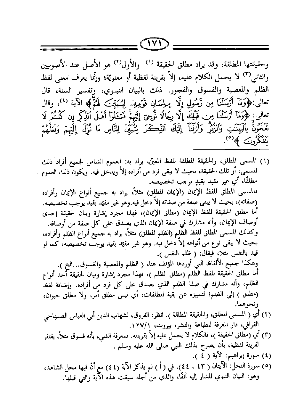 وحقيقتها المطلقة، وقد يراد مطلق الحقيقة (1) والأول (2) هو الأصل عند الأصوليين والثاني (3) لا يحمل الكلام عليه، إلا بقرينة لفظية أو معنوية؛ وإنما يعرف معنى لفظ الظلم والمعصية والفسوق والفجور. ذلك بالبيان النبوي، وتفسير السنة، قال تعالى: {وَمَا أَرْسَلْنَا مِنْ رَسُولٍ إِلَّا بِلِسَانِ قَوْمِهِ لِيُبَيِّنَ لَهُمْ} الآية (4) ، وقال تعالى: {وَمَا أَرْسَلْنَا مِنْ قَبْلِكَ إِلَّا رِجَالاً نُوحِي إِلَيْهِمْ فَاسْأَلوا أَهْلَ الذِّكْرِ إِنْ كُنْتُمْ لا تَعْلَمُونَ * بِالْبَيِّنَاتِ وَالزُّبُرِ وَأَنْزَلْنَا إِلَيْكَ الذِّكْرَ لِتُبَيِّنَ لِلنَّاسِ مَا نُزِّلَ إِلَيْهِمْ وَلَعَلَّهُمْ يَتَفَكَّرُونَ} (5) .