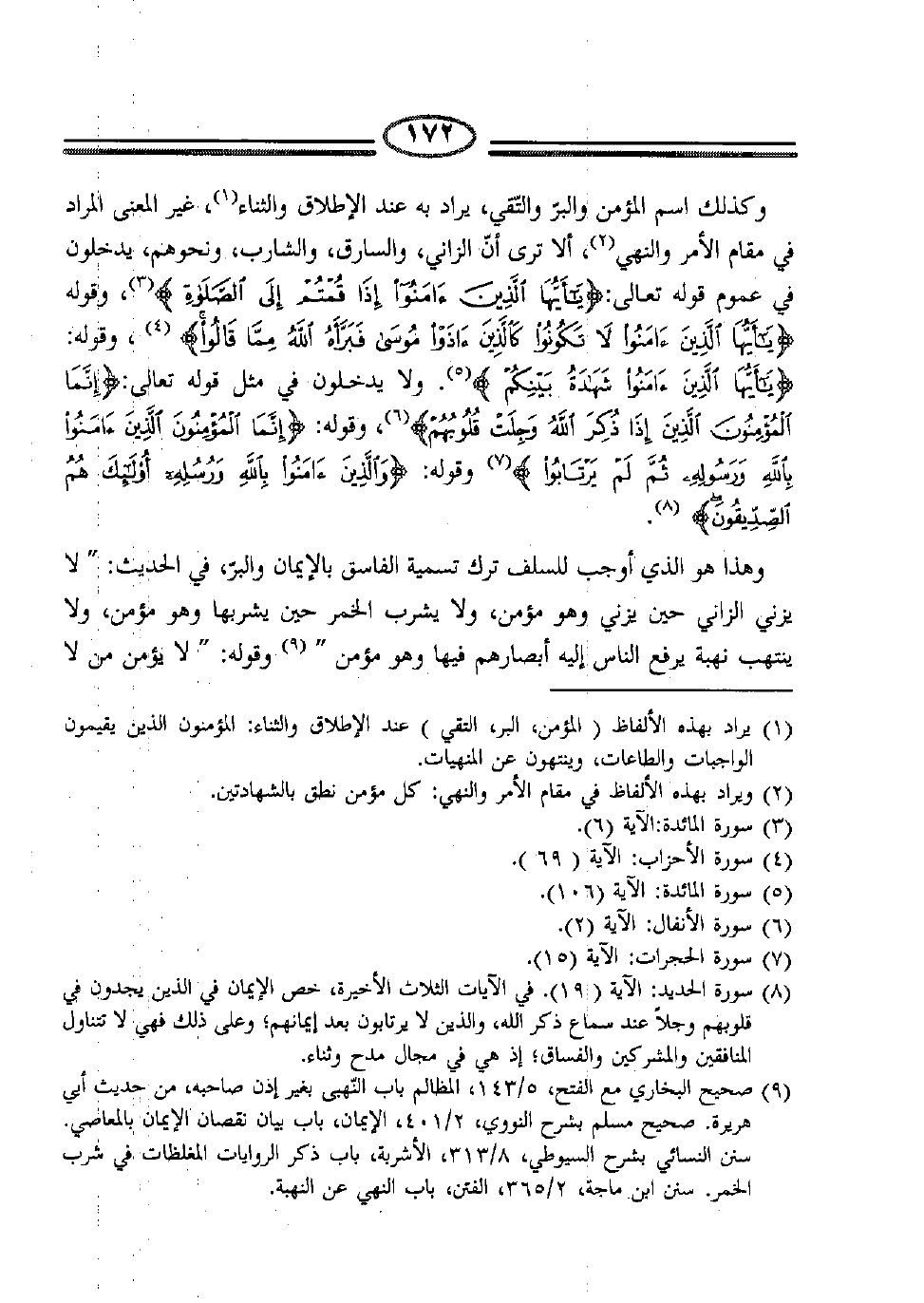 وكذلك اسم المؤمن والبر والتقي، يراد به عند الإطلاق والثناء (1) ، غير المعنى المراد في مقام الأمر والنهي (2) ، ألا ترى أن الزاني، والسارق، والشارب، ونحوهم, يدخلون في عموم قوله تعالى: {يَا أَيُّهَا الَّذِينَ آمَنُوا إِذَا قُمْتُمْ إِلَى الصَّلاةِ} (3) ، وقوله: {يَا أَيُّهَا الَّذِينَ آمَنُوا لا تَكُونُوا كَالَّذِينَ آذَوْا مُوسَى فَبَرَّأَهُ اللَّهُ مِمَّا قَالُوا} (4) ، وقوله: {يَا أَيُّهَا الَّذِينَ آمَنُوا شَهَادَةُ بَيْنِكُمْ} (5) . ولا يدخلون في مثل قوله تعالى: {إِنَّمَا الْمُؤْمِنُونَ الَّذِينَ إِذَا ذُكِرَ اللَّهُ وَجِلَتْ قُلُوبُهُمْ} (6) ، وقوله: {إِنَّمَا الْمُؤْمِنُونَ الَّذِينَ آمَنُوا بِاللَّهِ وَرَسُولِهِ ثُمَّ لَمْ يَرْتَابُوا} (7) وله: {وَالَّذِينَ آمَنُوا بِاللَّهِ وَرُسُلِهِ أُولَئِكَ هُمُ الصِّدِّيقُونَ} (8) .