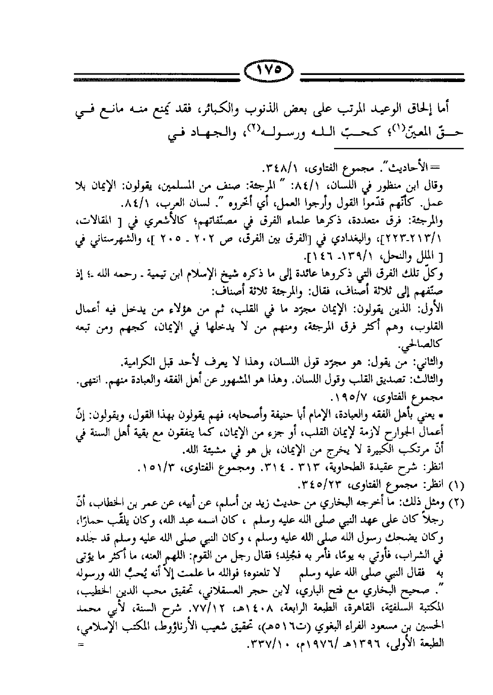 أما إلحاق الوعيد المرتب على بعض الذنوب والكبائر، فقد يمنع منه مانع في حق المعين (1) ؛ كحب الله ورسوله (2) ، والجهاد في
