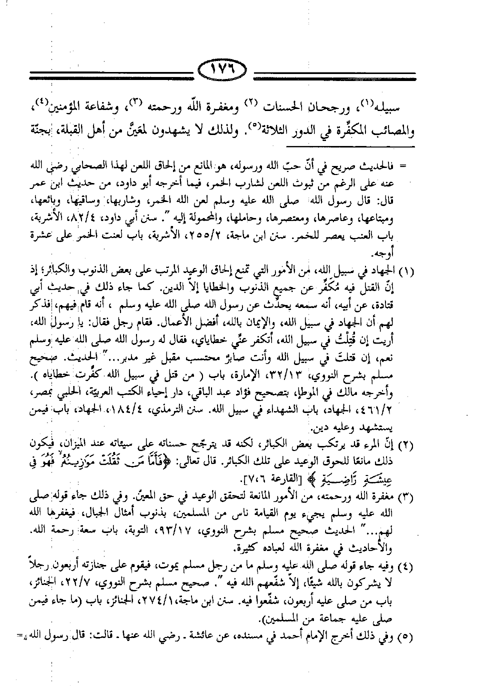 سبيله (1) ، ورجحان الحسنات (2) ومغفرة الله ورحمته (3) ، وشفاعة المؤمنين (4) ، والمصائب المكفرة في الدور الثلاثة (5) . ولذلك لا يشهدون لمعين من أهل القبلة، بجنة