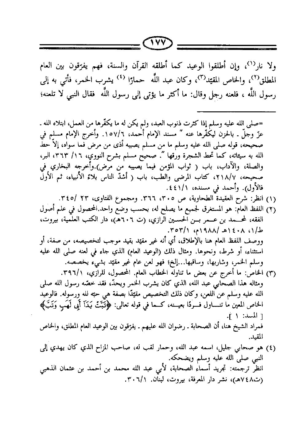 ولا نار (1) ، وإن أطلقوا الوعيد كما أطلقه القرآن والسنة، فهم يفرقون بين العام والمطلق (2) ، والخاص المقيد (3) ، وكان عبد الله حماراً (4) يشرب الخمر، فأتي به إلى رسول الله، فلعنه رجل وقال: ما أكثر ما يؤتى إلى رسول الله فقال النبي لا تلعنه؛