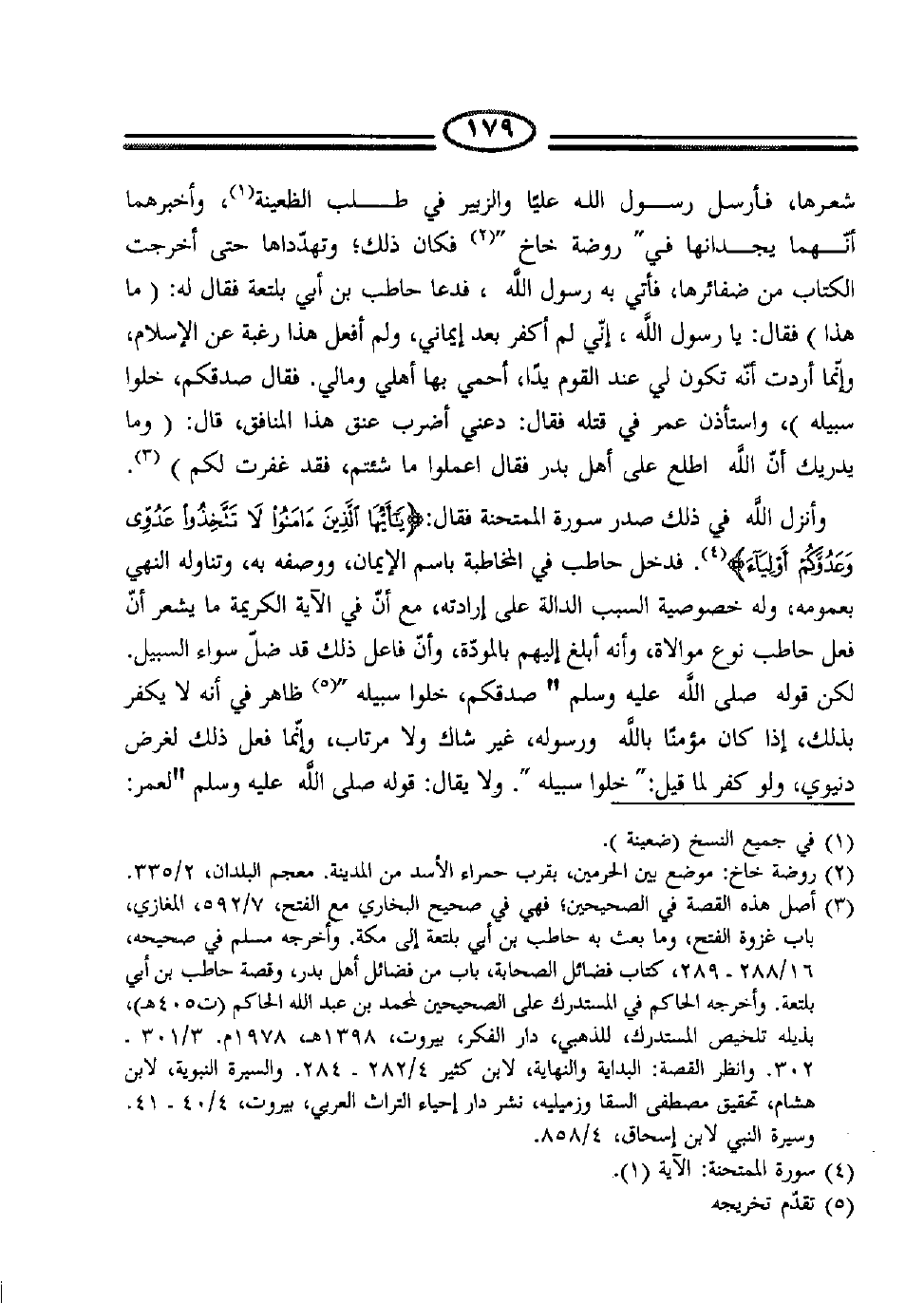 (3) أصل هذه القصة في الصحيحين؛ فهي في صحيح البخاري مع الفتح، 7/592، المغازي، 16/288-289، كتاب فضائل الصحابة، من فضائل أهل بدر، وقصة حاطب بن أبي بلتعة. وأخرجه الحاكم في "المستدرك" على الصحيحين لمحمد بن عبد الله الحاكم (ت 405هـ) ، بذيله تلخيص المستدرك، للذهبي، دار الفكر، بيروت، 1389هـ، 1978م. 13/301-302. انظر القصة: البدايةوالنهاية، لابن كثير 4/284-284. والسيرة النبوية، لابن هشام، تحقيق مصطفى السقا وزميليه، نشر دار إحياء التراث العربي، بيروت، 4/40-41 وسيرة النبي لابن إسحاق، 4/858.