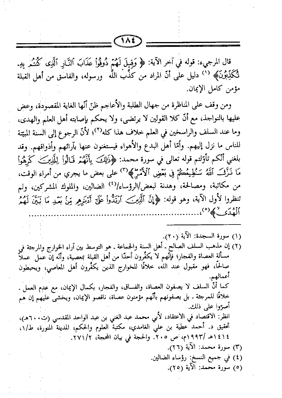 انظر: الاقتصاد في الاعتقاد، لأبي محمد عبد الغني بن عبد الواحد المقدسي (ت600هـ) ، تحقيق د. أحمد عطية بن علي الغامدي، مكتبة العلوم والحكم، المدينة المنورة، ط/1، 1414هـ/193م، ص205. والحجة في بيان المحجة، 2/271.