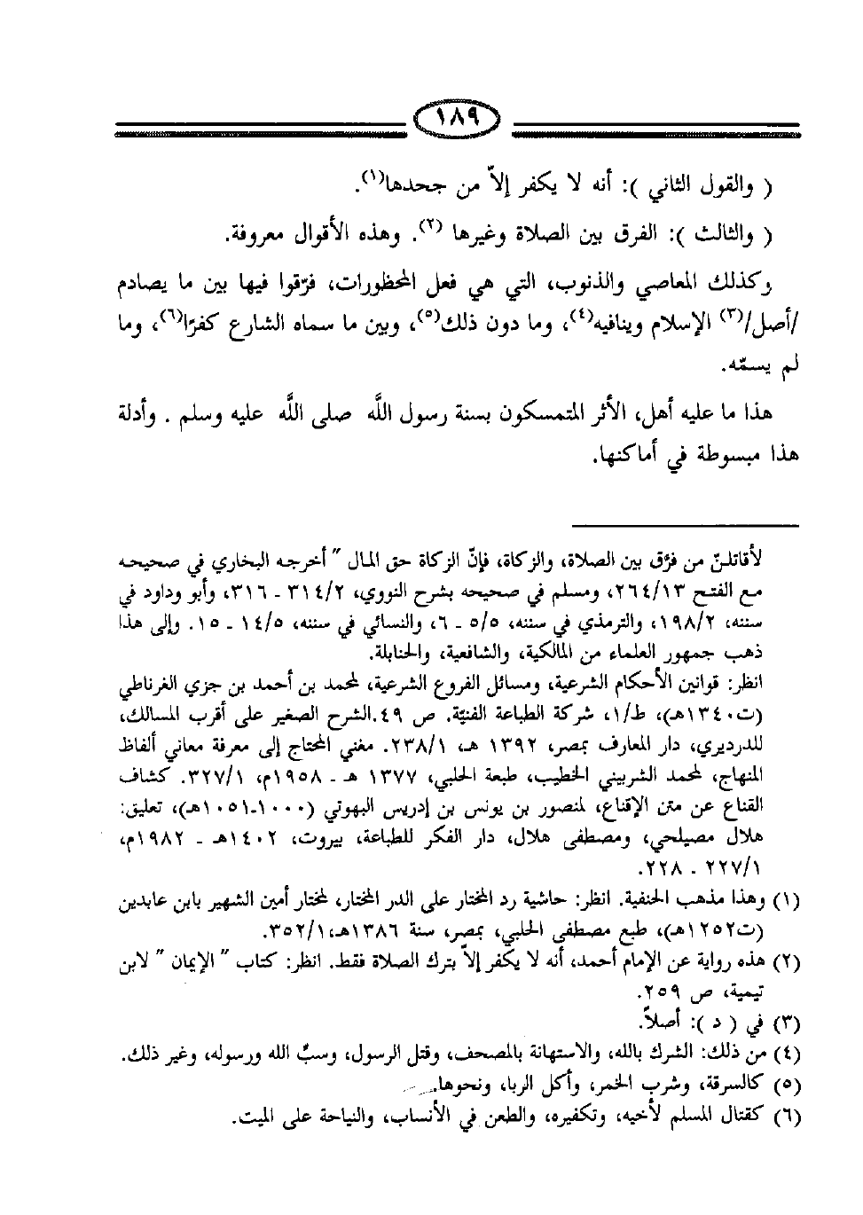 (2) هذه رواية الإمام أحمد، أنه لا يكفر إلا بترك الصلاة فقط. انظر: كتاب "الإيمان" بان تيمية، ص259.