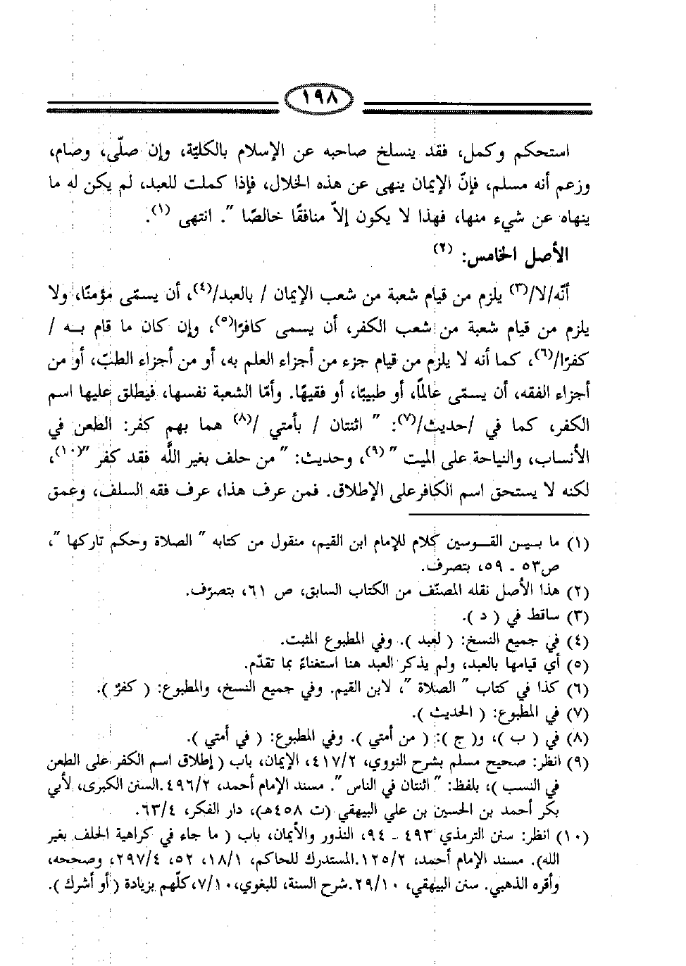 ولا يلزم من قيام شعبة من شعب الكفر، أن يسمى كافراً (4) ، وإن كان ما قام به /كفراً/ (5) ، كما أنه لا يلزم من قيام جزء من أجزاء العلم به، أو من أجزاء الطب، أو من أجزاء الفقه، أن يسمى عالماً، أو طبيباً، أو فقيهاً. وأما الشعبة نفسها، فيطلق عليها اسم الكفر، كما في /حديث/ (6) : "اثنتان /بأمتي/ (7) هما بهم كفر: الطعن في الأنساب، والنياحة على الميت " (8) ، وحديث: ((من حلف بغير الله فقد كفر)) (9) ، لكنه لا يستحق اسم الكافر على الإطلاق. فمن عرف هذا، عرف فقه السلف، وعمق