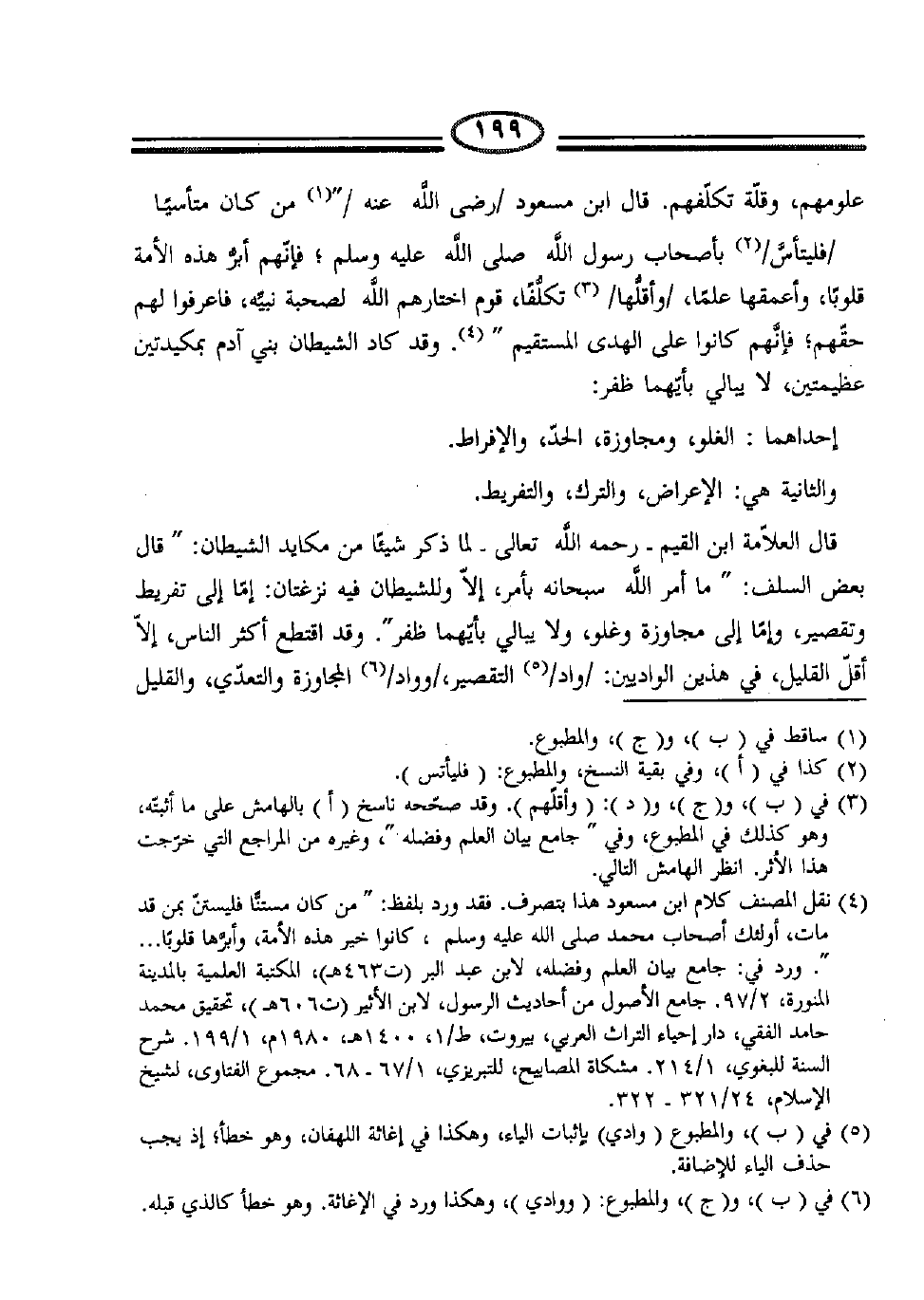 (4) نقل المصنف كلام ابن مسعود هذا بتصرف. فقد ورد بلفظ: "من كان مستناً فليستن بمن قد مات، أولئك أصحاب محمد صلى الله عليه وسلم، كانوا خير هذه الأمة، وأبرها قلوباً ... ". ورد في: جامع بيان العلم وفضله، لابن عبد البر (ت463هـ) ، المكتبة العلمية بالمدينة المنورة، 2/97. جامع الأصول من أحاديث الرسول، لابن الأثير (606هـ) ، تحقيق محمد حامد الفقي، دار إحياء التراث العربي، بيروت، ط/1، 1400هـ-1980م، 1/199. شرح السنة للبغوي، 1/214. مشكاة المصابيح للتبريزي، 1/67-68. مجموع الفتاوى، لشيخ الإسلام، 24/321-322.