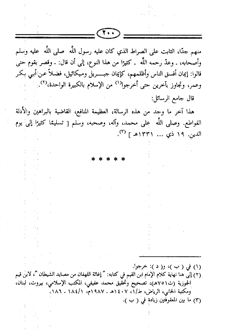 (2) إلى هنا نهاية كلام الإمام ابن القيم في كتابه: "إغاثة اللهفان من مصايد الشيطان"، لابن قيم الجوزية (ت751هـ) ، تصحيح وتحقيق محمد عفيفي، المكتب الإسلامي، بيروت، لبنان، ومكتبة الخاني، الرياض، ط/1، 1407هـ-1987م،1/184-186.