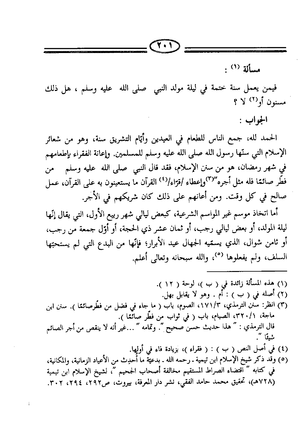 5 وقد ذكر شيخ الإسلام ابن تيمية –رحمه الله-بدعيّة ما أُحدِث من الأعياد الزمانية، والمكانية، في كتابه "اقتضاء الصراط المستقيم مخالفة أصحاب الجحيم"، لشيخ الإسلام ابن تيمية (728هـ) ، تحقيق محمد حامد الفقي، نشر دار المعرفة، بيروت، ص292، 294، 302.