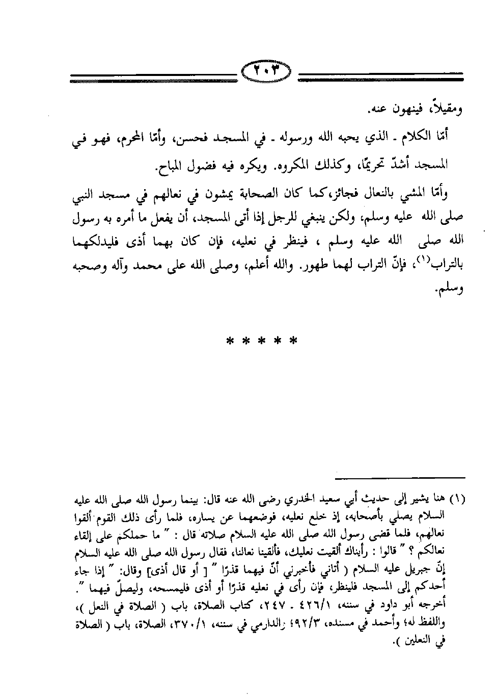 1 هنا يشير إلى حديث أبي سعيد الخدري رضي الله عنه قال: بينما رسول الله صلّى الله عليه وسلّم يصلي بأصحابه، إذ خلع نعليه فوضعهما عن يساره، فلما رأى ذلك القوم ألقوا نعالهم، فلما قضى رسول الله صلّى الله عليه وسلّم صلاته قال: "ما حملكم على إلقاء نعالكم؟ قالوا: رأيناك ألقيت نعليك، فألقينا نعالنا، فقال رسول الله صلّى الله عليه وسلّم إن جبريل عليه السلام أتاني فأخبرني أنَّ فيهما قذراً [أو قال أذى] وقال: " إذا جاء أحدكم إلى المسجد فلينظر، فإن رأى في نعليه قذراً أو أذى فليمسحه، وليصلّ فيهما ". أخرجه أبو داود في سننه، 1/426-247، كتاب الصلاة، باب (الصلاة في النعال) ، واللفظ له؛ وأحمد في مسنده، 3/92؛ والدارمي في سننه، 1/370، الصلاة، باب (الصلاة في النعلين) .