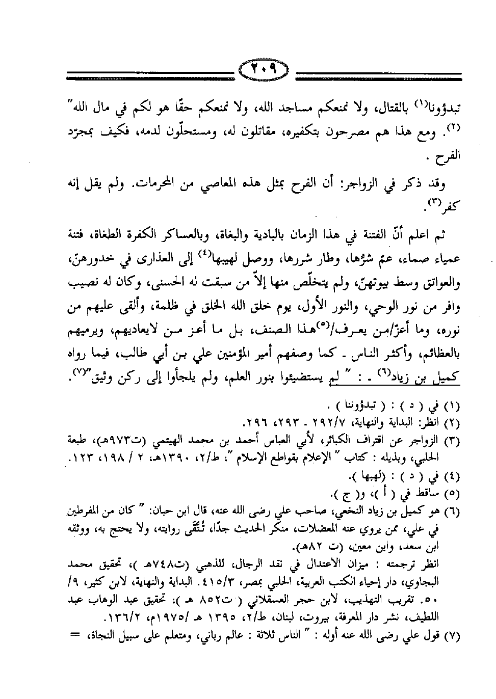 6 هو كميل بن زياد النخعي، صاحب علي رضي الله عته، قال ابن حبان:" كان من المفرطين في علي، ممن يروي عنه المعضلات، منكر الحديث جداً، تُتَّقَى روايته، ولا يحتج به، ووثقه ابن سعد، وابن معين، (ت82هـ) .