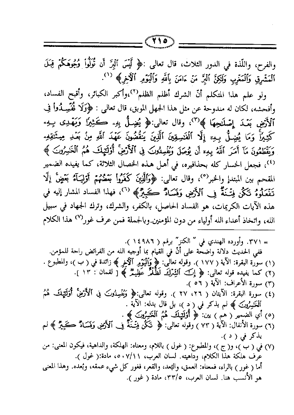 ولو علم هذا المتكلم أنّ الشرك أظلم الظلم (2) ، وأكبر الكبائر، وأقبح الفساد، وأفحشه، لكان له مندوحة عن مثل هذا الجهل الموبق، قال تعالى: {وَلا تُفْسِدُوا فِي الأَرْضِ بَعْدَ} (3) ، وقال تعالى: {يُضِلُّ بِهِ كَثِيراً وَيَهْدِي بِهِ كَثِيراً وَمَا يُضِلُّ بِهِ إِلاّ الْفَاسِقِينَ الَّذِينَ يَنْقُضُونَ عَهْدَ اللَّهِ مِنْ بَعْدِ مِيثَاقِهِ وَيَقْطَعُونَ مَا أَمَرَ اللَّهُ بِهِ أَنْ يُوصَلَ وَيُفْسِدُونَ فِي الْأَرْضِ أُولَئِكَ هُمُ الْخَاسِرُونَ} (4) ، فجعل الخسار كله بحذافيره، في أهل هذه الخصال الثلاثة، كما يفيده الضمير المقحم بين المبتدأ والخبر (5) ، وقال تعالى: {وَالَّذِينَ كَفَرُوا بَعْضُهُمْ أَوْلِيَاءُ بَعْضٍ إِلاَّ تَفْعَلُوهُ تَكُنْ فِتْنَةٌ فِي الأَرْضِ وَفَسَادٌ كَبِيرٌ} (6) ، فهذا الفساد المشار إليه في هذه الآيات الكريمات، هو الفساد الحاصل بالكفر، والشرك، وترك الجهاد في سبيل الله، واتخاذ أعداء الله أولياء من دون المؤمنين. وبالجملة فمن عرف غور (7) هذا الكلام