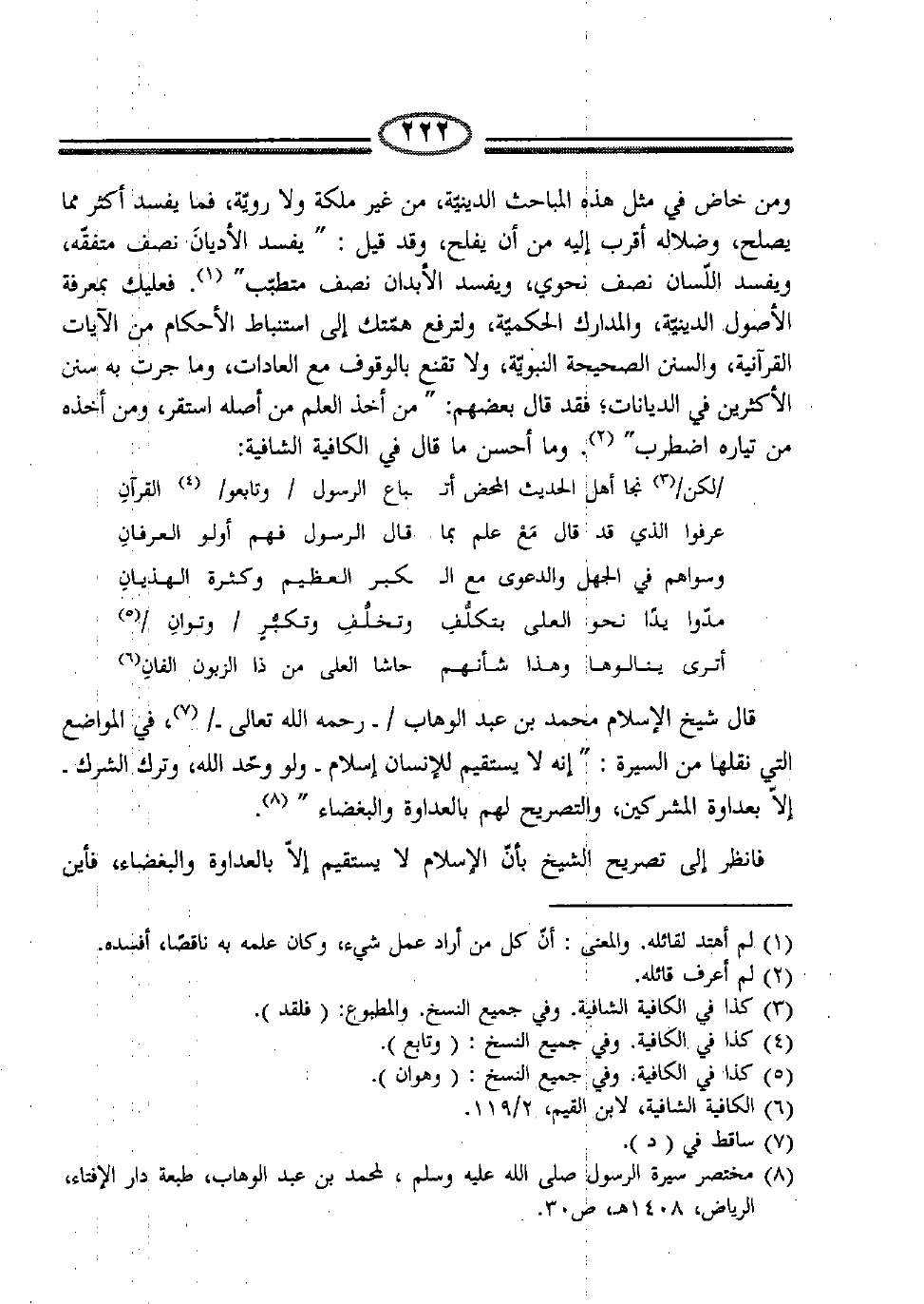 قال شيخ الإسلام محمد بن عبد الوهاب /- رحمه الله تعالى-/ (7) ، في المواضع التي نقلها من السيرة:" إنه لا يستقيم للإنسان إسلام -ولو وحّد الله، وترك الشرك- إلا بعداوة المشركين، والتصريح لهم بالعداوة والبغضاء" (8) .