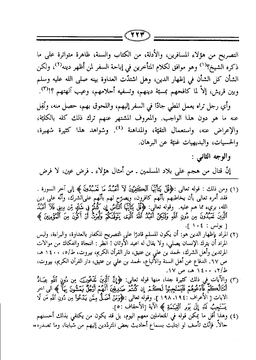 التصريح من هؤلاء المسافرين، والأدلة، من الكتاب والسنة، ظاهرة متواترة على ما ذكره الشيخ؟ (1) وهو موافق لكلام المتأخرين في إباحة السفر لمن أظهر دينه (2) ، ولكن الشأن كل الشأن في إظهار الدين، وهل اشتدّت العداوة بينه صلّى الله عليه وسلّم وبين قريش، إلا لما كافحهم بمسبة دينهم، وتسفيه أحلامهم، وعيب آلهتهم (3) ؟!
