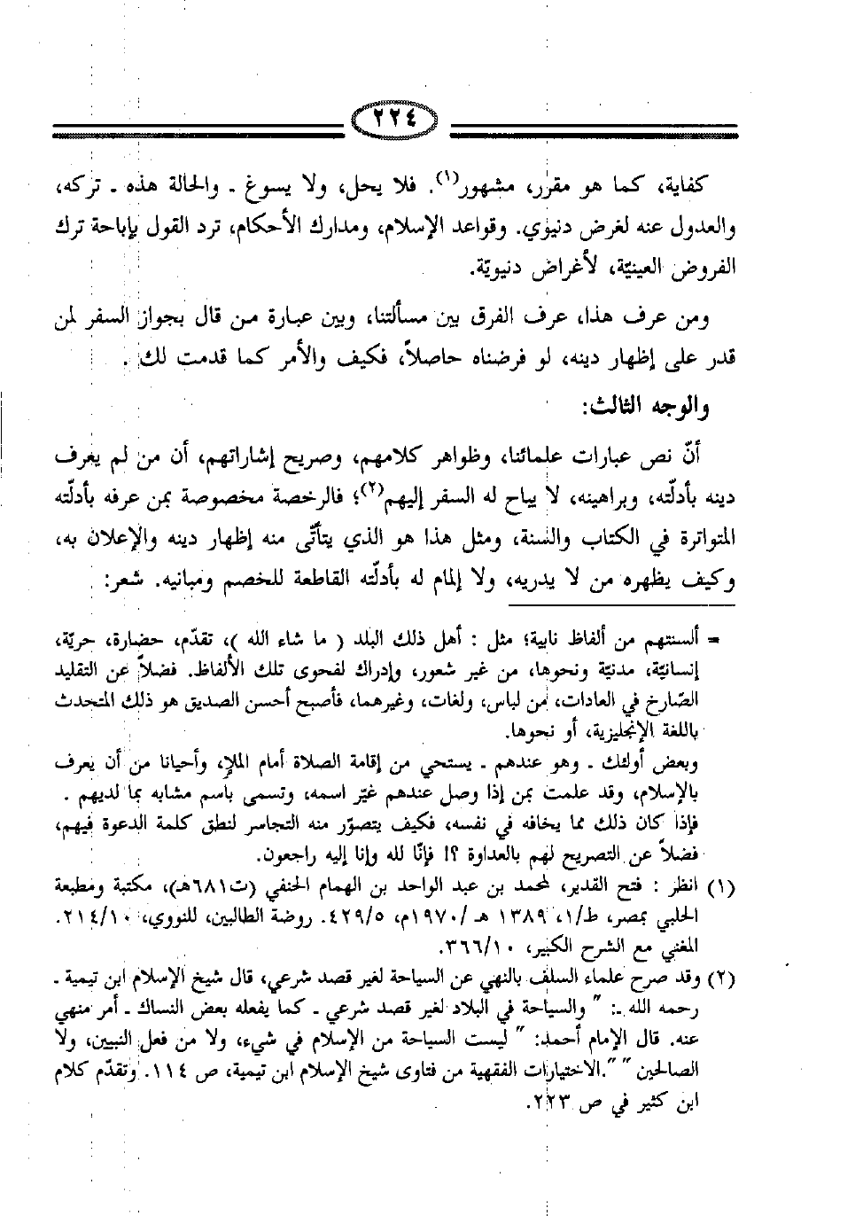 (2) وقد صرح علماء السلف بالنهي عن السياحة لغير قصد شرعي، قال شيخ الإسلام ابن تيمية-رحمه الله-:" والسياحة في البلاد لغير قصد شرعي-كما يفعله بعض النساك-أمر منهي عنه. قال الإمام أحمد:" ليست السياحة من الإسلام في شيء، ولا من فعل النبيين، ولا الصالحين". الاختيارات الفقهية من فتاوى شيخ الإسلام ابن تيمية، ص114. وتقدّم كلام ابن كثير في ص223.