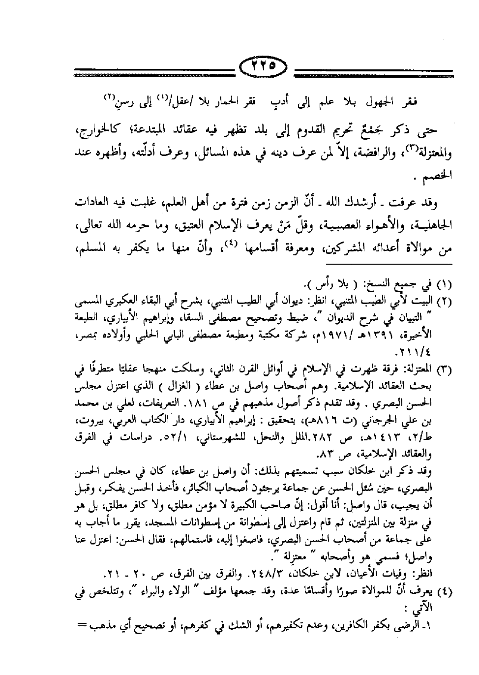 (3) المعتزلة: فرقة ظهرت في الإسلام في أوائل القرن الثاني، وسلكت منهجا عقليّا متطرفاً في بحث العقائد الإسلامية. وهم أصحاب واصل بن عطاء (الغزال) الذي اعتزل مجلس الحسن البصري. وقد تقدم ذكر أصول مذهبهم في ص181. التعريفات، لعلي بن محمد بن علي الجرجاني (ت816هـ) ، بتحقيق: إبراهيم الأبياري، دار الكتاب العربي، بيروت، ط/2، 1413هـ، ص282. الملل والنحل، للشهرستاني، 1/52. دراسات في الفرق والعقائد الإسلامية، ص82.