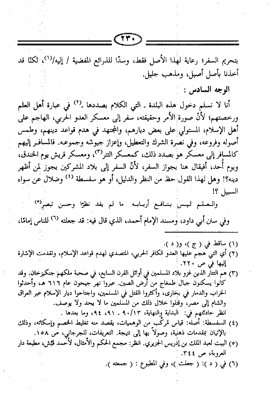 أنا لا نسلم دخول هذه البلدة-التي الكلام بصددها- (2) في عبارة أهل العلم ورخصتهم؛ لأنّ صورة الأمر وحقيقته، سفر إلى معسكر العدو الحربي، الهاجم على أهل الإسلام، المستولي على بعض ديارهم، والمجتهد في هدم قواعد دينهم، وطمس أصوله وفروعه، وفي نصرة الشرك والتعطيل، وإعزاز جيوشه وجموعه. فالمسافر إليهم كالمسافر إلى معسكر هو بصدد ذلك، كمعسكر التتر (3) ، ومعسكر قريش يوم الخندق، ويوم أحد، أفيقال هنا بجواز السفر، لأنّ السفر إلى بلاد المشركين يجوز لمن أظهر دينه؟! وهل لهذا القول حظ من النظر والدليل، أو سفسطة (4) وضلال عن سواء السبيل؟!