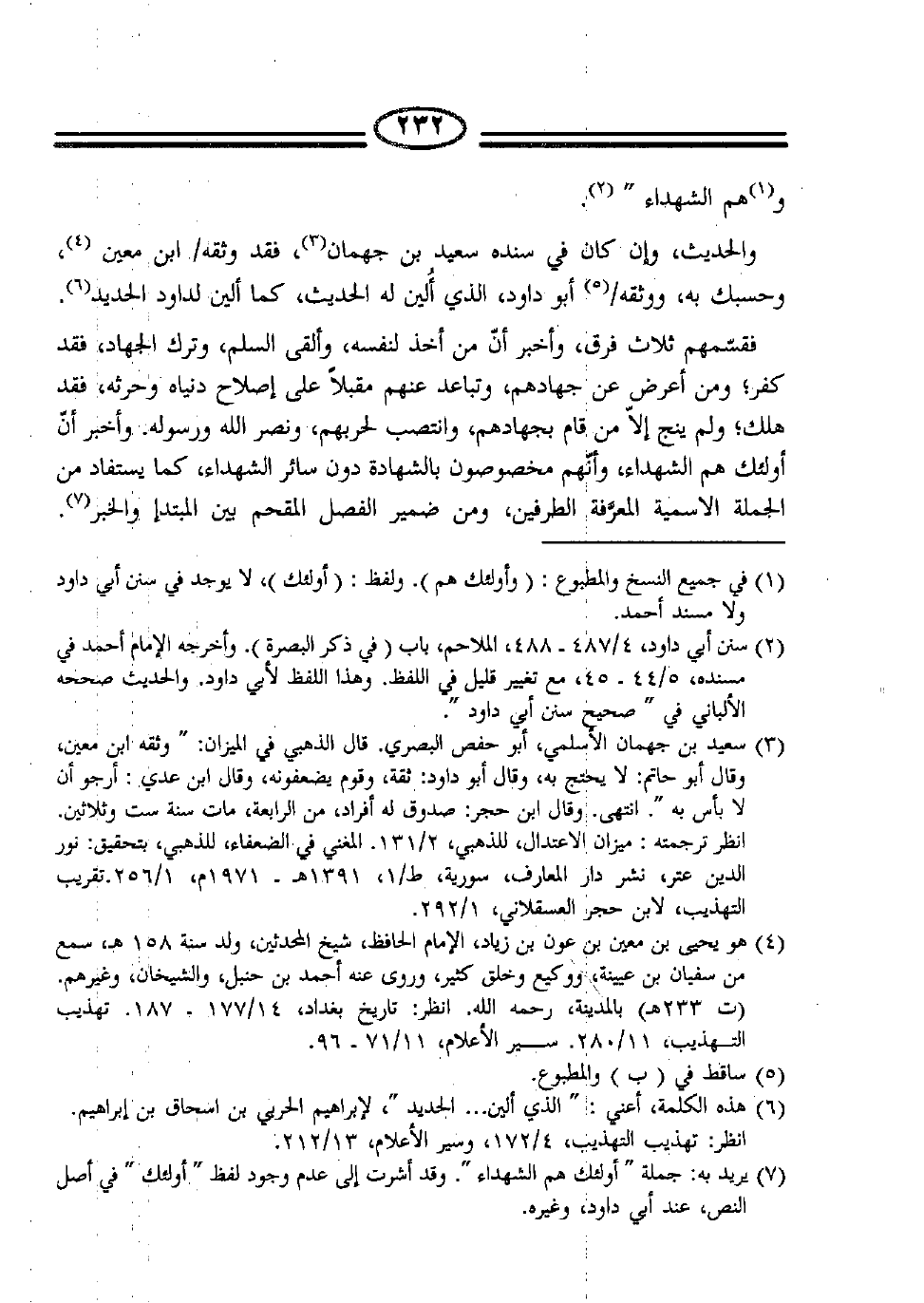 (7) يريد به: جملة" اولئك هم الشهداء". وقد أشرت إلى عدم وجود لفظ" أولئك" في أصل النص، عند أبي داود، وغيره.