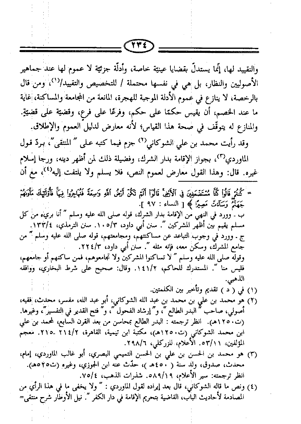 (4) ونص ما قاله الشوكاني، قال بعد إيراده لقول الماوردي:" ولا يخفى ما في هذا الرأي من المصادمة لأحاديث الباب، القاضية بتحريم الإقامة في دار الكفر". نيل الأوطار شرح منتقىالأخبار من أحاديث سيد الأخيار، لمحمد بن علي بن محمد الشوكاني، طبعة الحلبي الأخيرة بمصر، 8/31.