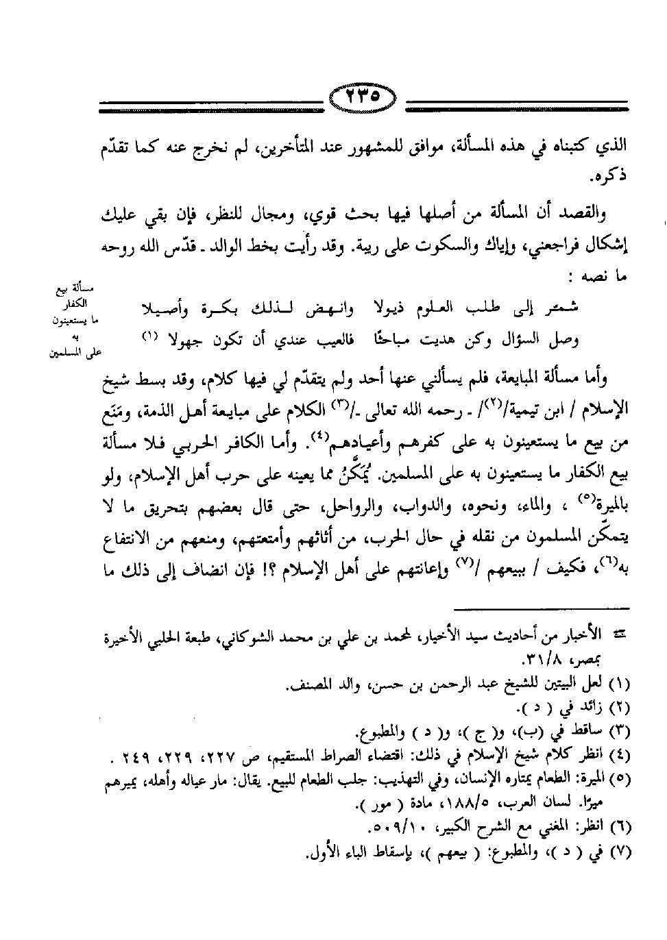 وأما مسألة المبايعة، فلم يسألني عنها أحد ولم يتقدّم لي فيها كلام، وقد بسط شيخ الإسلام /ابن تيمية/ (6) /- رحمه الله تعالى-/ (7) الكلام على مبايعة أهل الذمة، ومَنَع من بيع ما يستعينون به على كفرهم وأعيادهم (8) . وأما الكافر الحربي فلا مسألة بيع الكفار ما يستعينون به على المسلمين. يُمَكَّنُ مما يعينه على حرب أهل الإسلام، ولو بالميرة (9) ، والماء، ونحوه، والدواب، والرواحل، حتى قال بعضهم بتحريق ما لا يتمكن المسلمون من نقله في حال الحرب، من أثاثهم وأمتعتهم، ومنعهم من الانتفاع به (10) ، فكيف /ببيعهم/ (11) وإعانتهم على أهل الإسلام؟! فإن انضاف إلى ذلك ما