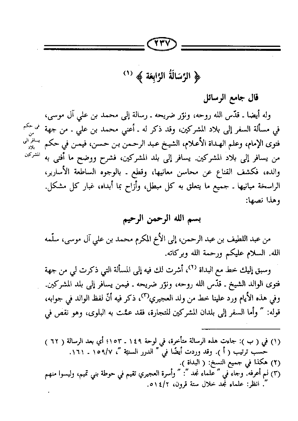 وله أيضا – قدّس الله روحه، ونوّر ضريحه- رسالة إلى محمد بن علي آل موسى، في مسألة السفر إلى بلاد المشركين، وقد ذكر له –أعني محمد بن علي- من جهة فتوى الإمام، وعلم الهداة الأعلام، الشيخ عبد الرحمن بن حسن، فيمن في حكم من يسافر إلى بلاد المشركين. يسافر إلى بلد المشركين، فشرح ووضح ما أفتى به والده، فكشف القناع عن محاسن معانيها، وقطع – بالوجوه الساطعة الأسارير، الراسخة مبانيها- جميع ما يتعلق به كل مبطل، وأزاح بما أبداه، غبار كل مشكل.