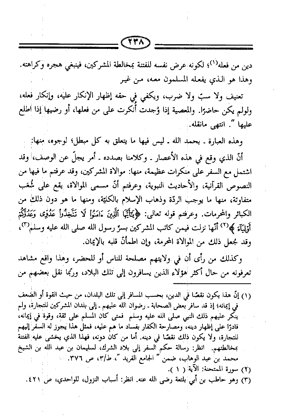 أنّ الذي وقع في هذه الأعصار -وكلامنا بصدده- أمر يجلّ عن الوصف، وقد اشتمل مع السفر على منكرات عظيمة، منها: موالاة المشركين، وقد عرفتم ما فيها من النصوص القرآنية، والأحاديث النبوية، وعرفتم أنّ مسمى الموالاة، يقع على شُعَب متفاوتة، منها ما يوجب الردّة وذهاب الإسلام بالكليّة، ومنها ما هو دون ذلك من الكبائر والمحرمات. وعرفتم قوله تعالى: {يَا أَيُّهَا الَّذِينَ آمَنُوا لا تَتَّخِذُوا عَدُوِّي وَعَدُوَّكُمْ أَوْلِيَاءَ} (2) أنّها نزلت فيمن كاتب المشركين بسرِّ رسول الله صلّى الله عليه وسلّم (3) ، وقد جُعل ذلك من الموالاة المحرمة، وإن اطمأنّ قلبه بالإيمان.