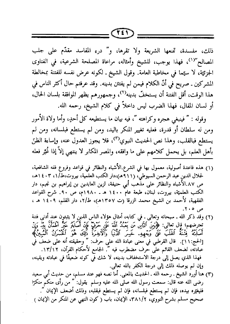 ذلك، مفسدة تمنعها الشريعة ولا تقرها، و "درء المفاسد مقدّم على جلب المصالح" (1) ،فهذا، يوجب للشيخ وأمثاله، مراعاة المصلحة الشرعية، في الفتاوى الجزئية، لا سيّما في مخاطبة العامة. وقول الشيخ –لكونه عرض نفسه للفتنة بمخالطة المشركين- صريح في أن الكلام فيمن لم يفتتن بدينه، وقد عرفتم حال أكثر الناس في هذا الوقت، أقل الفتنة أن يستخف بدينه (2) ، وجمهورهم يظهر الموافقة بلسان الحال، أو لسان المقال، فهذا الضرب ليس داخلاً في كلام الشيخ، رحمه الله.