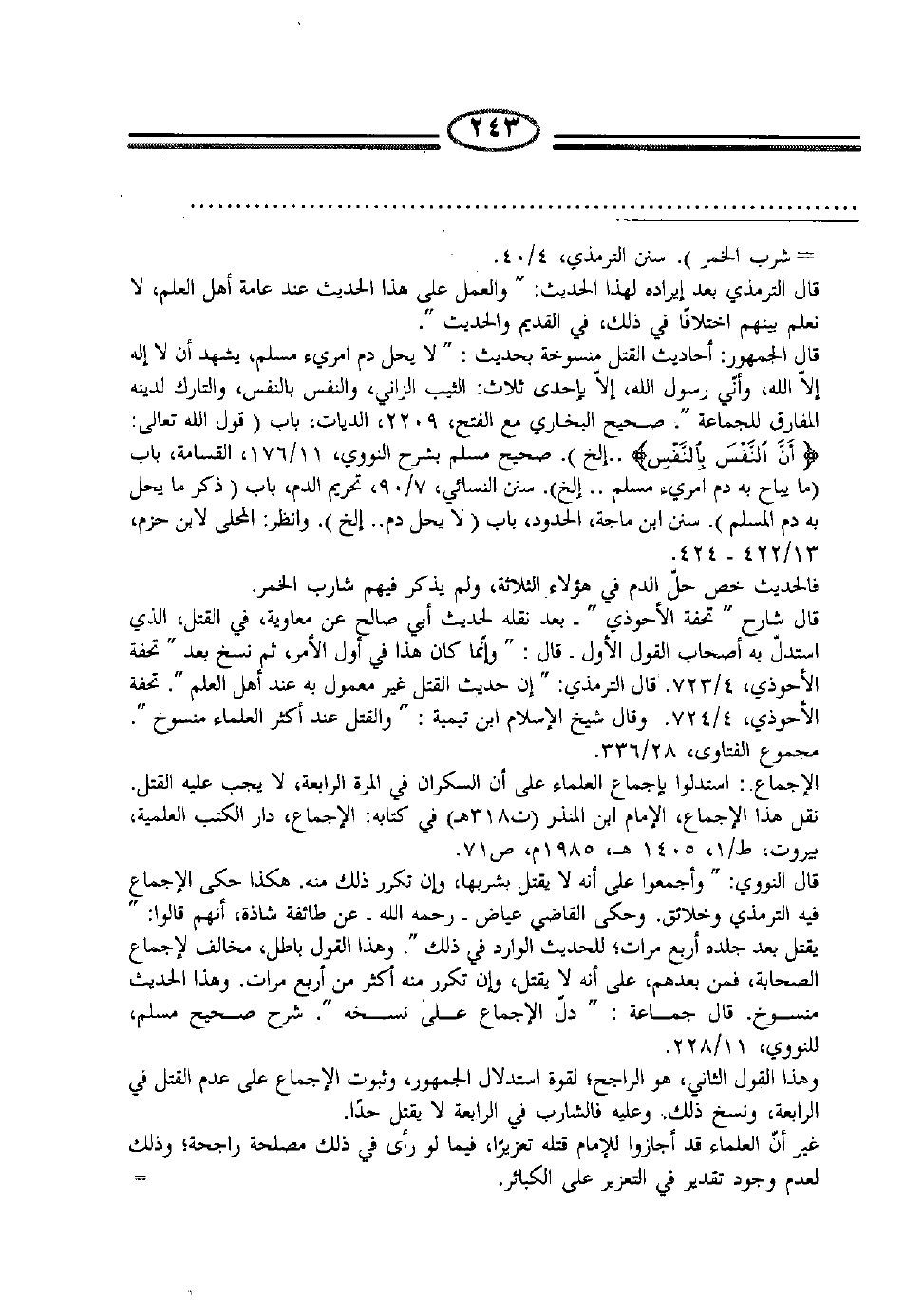 قال الجمهور: أحاديث القتل منسوخة بحديث: " لا يحل دم امرئ مسلم، يشهد أن لا إله إلا الله، وأني رسول الله، إلاّ بإحدى ثلاث: الثيب الزاني، والنفس بالنفس، والتارك لدينه المفارق للجماعة ". صحيح البخاري مع الفتح 2209، الديات باب (قولع تعالى: {} .. إلخ) . صحيح مسلم بشرح النووي 11/176، القسامة باب (ما يباح به دم امرئ مسلم ... إلخ) . سنن النسائي 7/90، تحريم الدم باب (ذكر ما يحل به دم المسلم) . سنن ابن ماجة، الحدود باب (لا يحل دم.. إلخ) . وانظر: المحلى لابن حزم، 13/422-424.