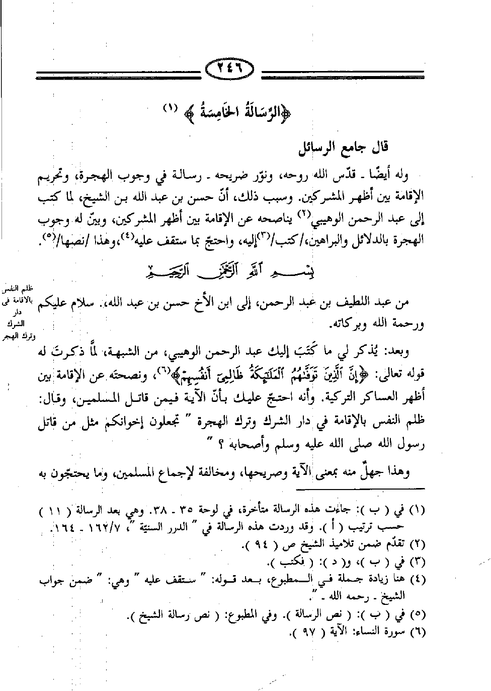 وبعد: يُذكر لي مل كَتَبَ إليك عبد الرحمن الوهيبي، من الشبهة، لمّا ذكرتَ له قوله تعالى: {إِنَّ الَّذِينَ تَوَفَّاهُمُ الْمَلائِكَةُ ظَالِمِي أَنْفُسِهِمْ} (6) ، ونصحتَه عن الإقامة بين أظهر العساكر التركية. وأنه احتجّ عليك بأنّ الآية فيمن قاتل المسلمين، وقال: ظلم النفس بالإقامة في دار الشرك وترك الهجرة " تجعلون إخوانكم مثل من قاتل رسول الله صلّى الله عليه وسلّم وأصحابه؟ "