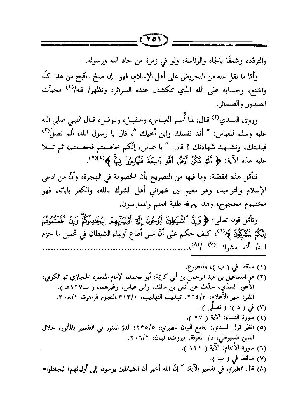 وتأمّل قوله تعالى: {وَإِنَّ الشَّيَاطِينَ لَيُوحُونَ إِلَى أَوْلِيَائِهِمْ لِيُجَادِلُوكُمْ وَإِنْ أَطَعْتُمُوهُمْ إِنَّكُمْ لَمُشْرِكُونَ} (6) ، كيف حكم على أنّ من أطاع أولياء الشيطان في تحليل ما حرّم الله /أنه مشرك (7) / (8) ،.................................................................................