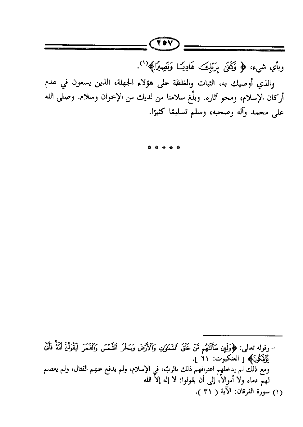 والذي أوصيك به، الثبات والغلظة على هؤلاء الجهلة، الذين يسعون في هدم أركان الإسلام، ومحو آثاره. وبلّغ سلامنا من لديك من الإخوان وسلام. وصلى الله على محمد وآله وصحبه، وسلم تسليماً كثيراً.