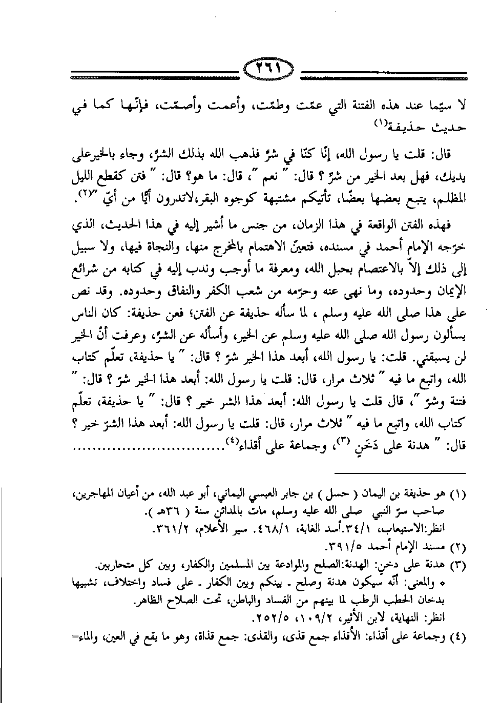 فهذه الفتن الواقعة في هذا الزمان، من جنس ما أشير إليه في هذا الحديث، الذي خرّجه الإمام أحمد في مسنده، فتعيّن الاهتمام بالمخرج منها، والنجاة فيها، ولا سبيل إلى ذلك إلاّ بالاعتصام بحبل الله، ومعرفة ما أوجب وندب إليه كتابه من شرائع الإيمان وحدوده، وما نهى عنه وحرّمه من شعب الكفر والنفاق وحدوده، وقد نصّ على هذا صلّى الله عليه وسلّم، لما سأله حذيفة عن الفتن؛ فعن حذيفة: كان الناس يسألون رسول الله صلّى الله عليه وسلّم عن الخير، وأسأله عن الشرِّ، وعرفت أن الخير لن يسبقني، قلت: يا رسول الله، أبعد هذا الخير شر؟ قال: " يا حذيفة تعلّم كتاب الله، واتبع ما فيه " ثلاث مرار، قال: قلت يا رسول الله، أبعد هذا الخير شر؟ قال: " فتنة وشر "، قال قلت يا رسول الله أبعد هذا الشر من خير؟ قال: " يا حذيفة تعلّم كتاب الله، واتبع ما فيه " ثلاث مرار، قال قلت يا رسول الله أبعد هذا الشر من خير؟ قال: " هدنة على دَخَنٍ (3) ، وجماعة على أقذاء (4)