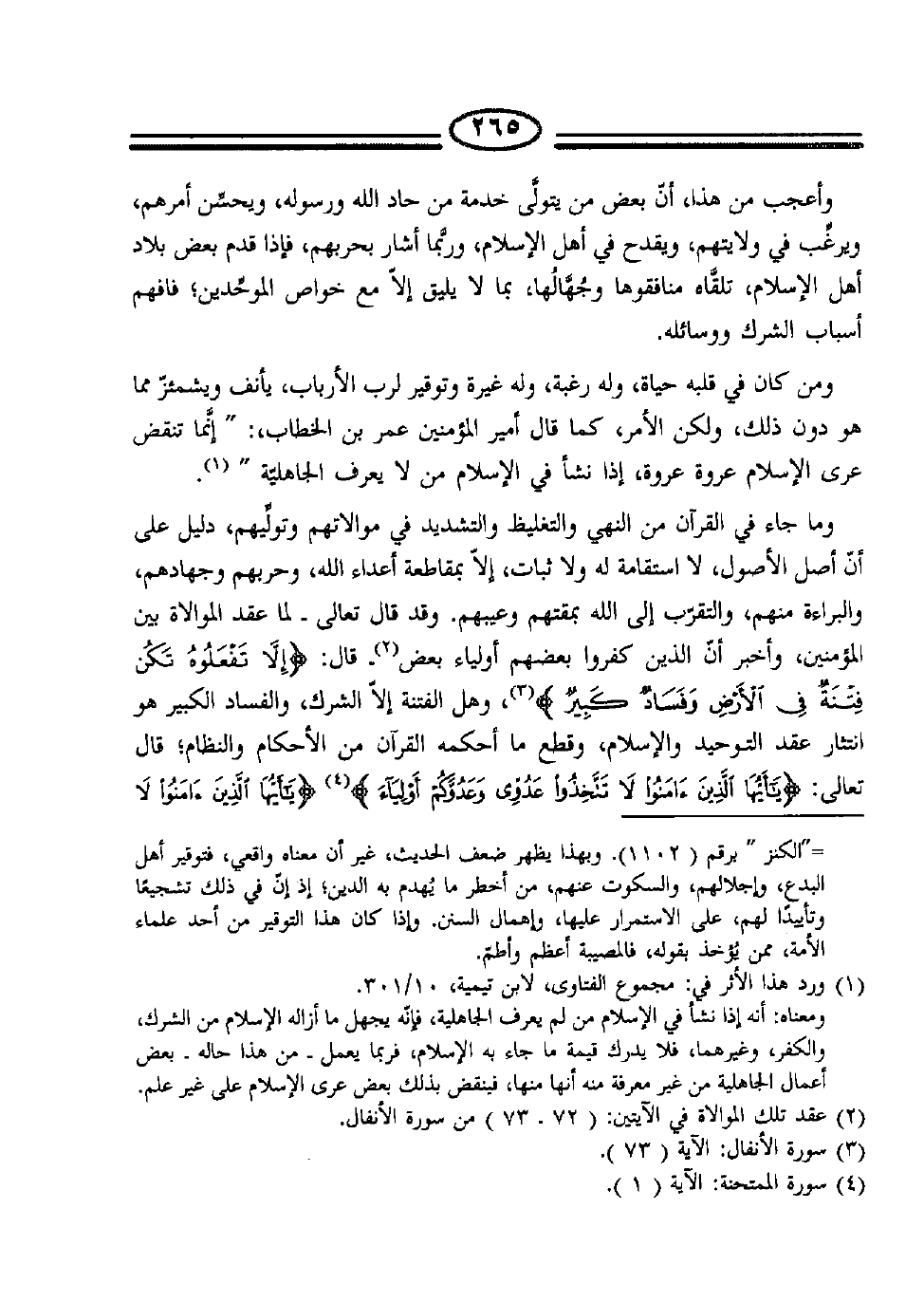 وما جاء في القرآن من النهي والتغليظ والتشديد في موالاتهم وتولِّيهم، دليل على أنّ أصل الأصول، لا استقامة له ولا ثبات، إلا بمقاطعة أعداء الله، وحربهم وجهادهم، والبراءة منهم، والتقرب إلى الله بمقتهم وعيبهم؛ وقد قال تعالى - لما عقد الموالاة بين المؤمنين، وأخبر أنّ الذين كفروا بعضهم أولياء بعض- (2) قال: {إِلاَّ تَفْعَلُوهُ تَكُنْ فِتْنَةٌ فِي الْأَرْضِ وَفَسَادٌ كَبِيرٌ} (3) ، وهل الفتنة إلا الشرك، والفساد الكبير هو انتثار عقد التوحيد والإسلام، وقطع ما أحكم القرآن من الأحكام والنظام؛ وقال تعالى: {يَا أَيُّهَا الَّذِينَ آمَنُوا لا تَتَّخِذُوا عَدُوِّي وَعَدُوَّكُمْ أَوْلِيَاءَ} (4) {يَا أَيُّهَا الَّذِينَ آمَنُوا لا
