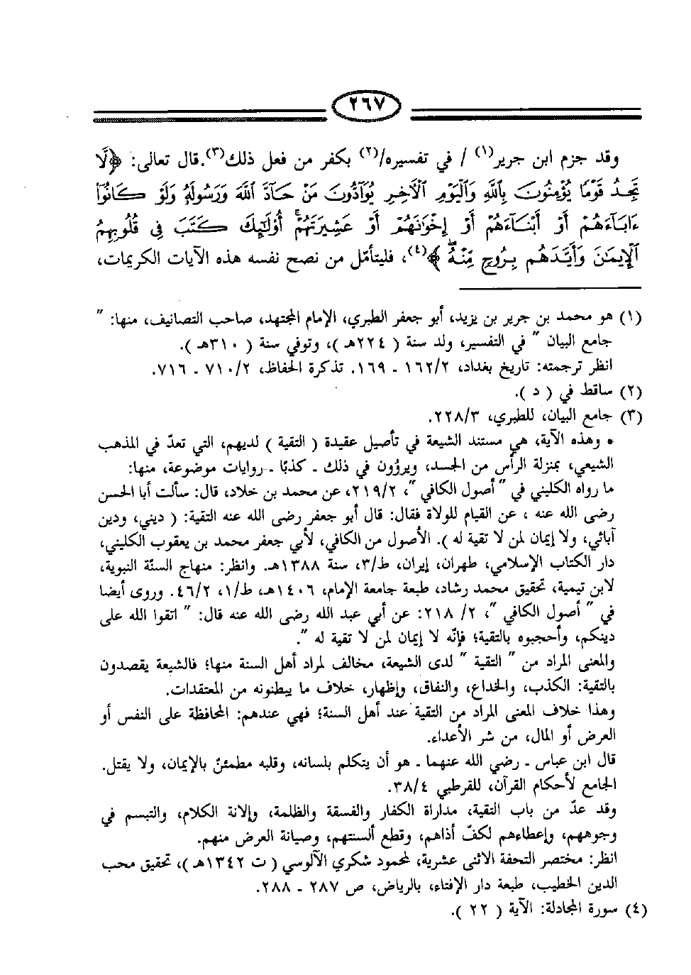 وقد جزم ابن جرير (1) /في تفسيره/ (2) بكفر من فعل ذلك (3) . قال تعالى: {لا تَجِدُ قَوْماً يُؤْمِنُونَ بِاللَّهِ وَالْيَوْمِ الْآخِرِ يُوَادُّونَ مَنْ حَادَّ اللَّهَ وَرَسُولَهُ وَلَوْ كَانُوا آبَاءَهُمْ أَوْ أَبْنَاءَهُمْ أَوْ إِخْوَانَهُمْ أَوْ عَشِيرَتَهُمْ أُولَئِكَ كَتَبَ فِي قُلُوبِهِمُ الْأِيمَانَ وَأَيَّدَهُمْ بِرُوحٍ مِنْهُ} (4) ، فليتأمّل من نصح نفسه هذه الآيات الكريمات،