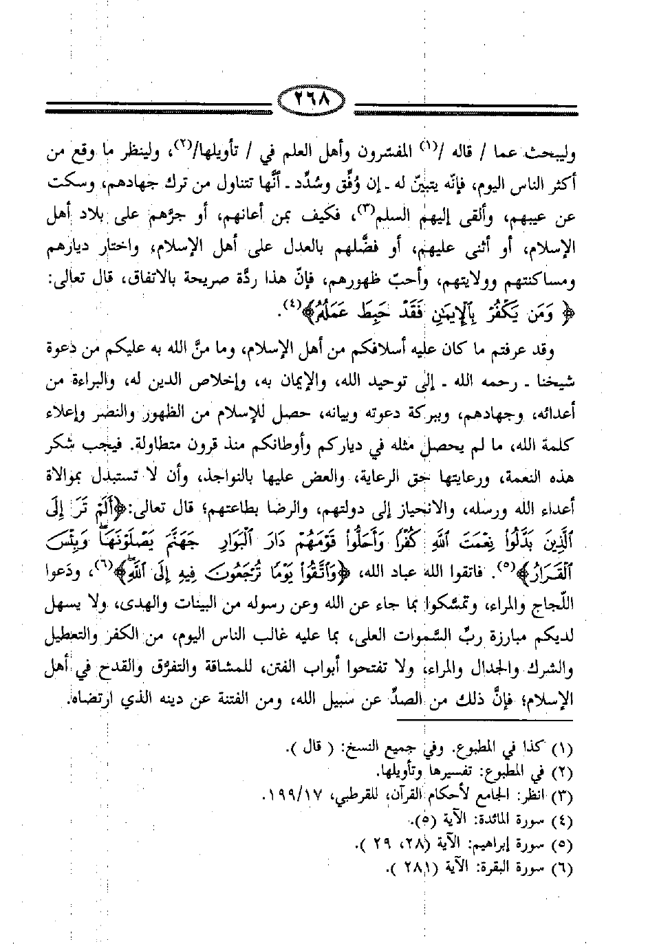 وليبحث عمّا /قاله/ (1) المفسِّرون وأهل العلم في /تأويلها/ (2) ، ولينظر ما وقع من أكثر الناس اليوم، فإنّه يتبين له -إن وُفِّق وسُدِّد- أنّها تتناول من ترك جهادهم، وسكت عن عيبهم، وألقى إليهم السلم (3) ، فكيف بمن أعانهم، أو جرَّهم على بلاد أهل الإسلام، أو أثنى عليهم، أو فضَّلهم بالعدل على أهل الإسلام، واختار ديارهم ومساكنتهم وولايتهم، وأحبَّ ظهورهم، فإنّ هذا رِدَّة صريحة بالاتفاق، قال تعالى: {وَمَنْ يَكْفُرْ بِالْأِيمَانِ فَقَدْ حَبِطَ عَمَلُهُ} (4) .