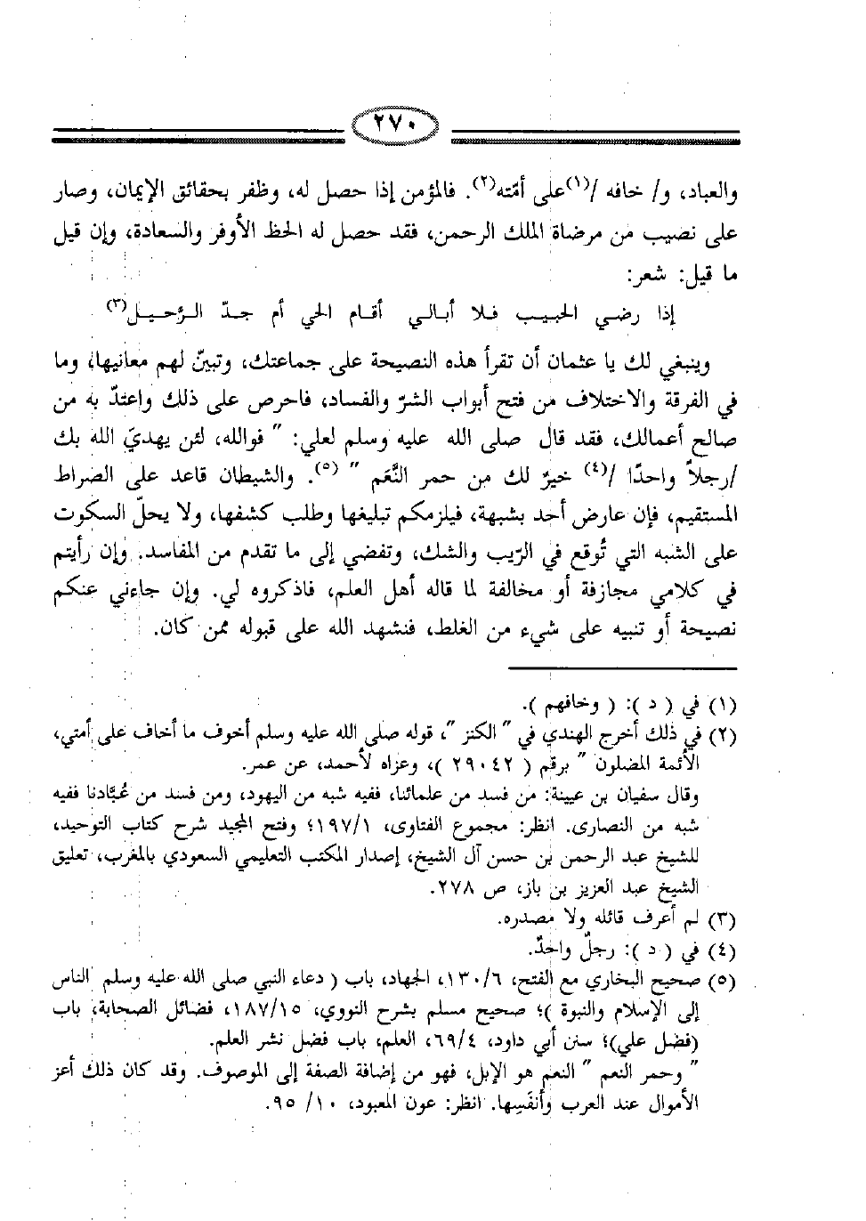 وينبغي لك يا عثمان أن تقرأ هذه النصيحة على جماعتك، وتبيّن لهم معانيها، وما في الفرق والاختلاف من فتح أبواب الشر والفساد، فاحرص على ذلك واعتدّ به من صالح أعمالك، فقد قال صلّى الله عليه وسلّم لعلي: " فوالله، لأن يهدي الله بك /رجلاً واحداً/ (4) خيرٌ لك من حمر النَّعَم " (5) . والشيطان قاعد على الصراط المستقيم، فإن عاض أحد بشبهة، فيلزمكم تبليغها وطلب كشفها، ولا يحلُّ السكوت على الشبه التي تُقع في الريب والشك، وتفضي غلى ما تقدم من المفاسد. وإن رأيتم في كلامي مجازفة أو مخالفة لما قاله أهل العلم، فاذكروه لي. وإن جاءني عنكم نصيحة أو تنبيه على شيء من الغلط، فنشهد الله على قبوله ممن كان.