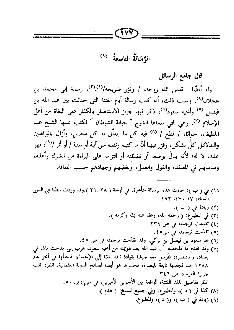 وله أيضاً - قدس الله روحه، /ونوّر ضريحه/ (2) - (3) ، رسالة إلى محمد بن عجلان (3) .وسبب ذلك، أنه كتب رسالة أيام الفتنة، التي حدثت بين عبد الله بن فيصل (5) وأخيه سعود (6) ، ذكر فيها جواز الاستنصار بالكفار على البغاة من أهل الإسلام (7) ، وهي التي سمّاها الشيخ "حبالة الشيطان" فكتب عليها الشيخ عبد اللطيف، جواباً، /قطع/ (8) فيه كلّ ما يتعلق به كل مبطل، وأزال بالبراهين والدلائل كلَّ مشكل، وقرّر فيها أن ما كتبه ونقله من آية أو سنة /أو أثر/ (9) ، فهو عليه لا له، لأنه يدل بوضعه أو تضمّنه أو التزامه على البراءة من الشرك وأهله، ومباينتهم في المعتقد، والقول والعمل، وبغضهم وجهادهم حسب الطاقة.