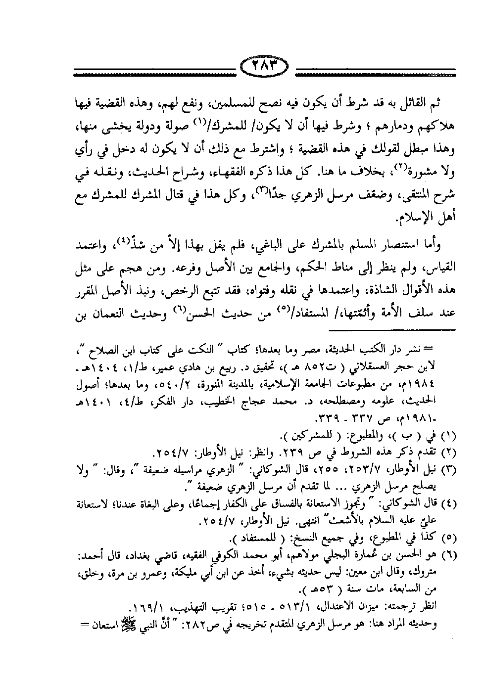 (3) نيل الأوطار، 7/253، 255، قال الشوكاني: "الزهري مراسيله ضعيفة"، وقال: "ولا يصلح مرسل الزهري ... لما تقدم أن مرسل الزهري ضعيف".