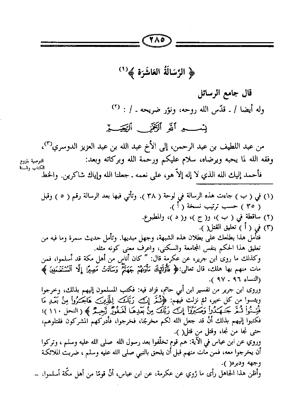 من عبد اللطيف بن عبد الرحمن، إلى الأخ عبد الله بن عبد العزيز الدوسري (3) ، وفقه الله لما يحبه ويرضاه، سلام عليكم ورحمة الله وبركاته وبعد:
