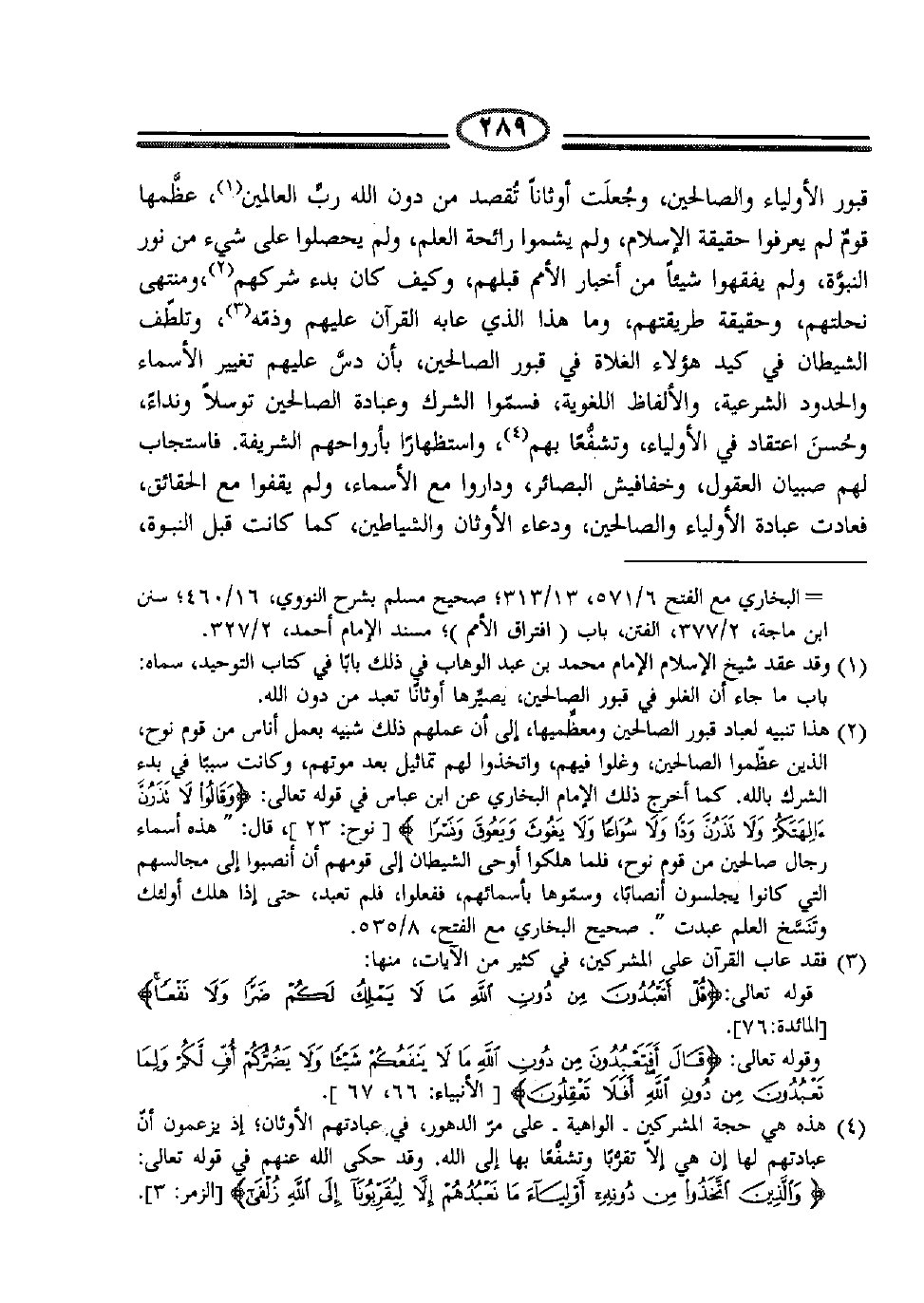 (1) وقد عقد شيخ الإسلام محمد بن عبد الوهاب في ذلك باباً في كتاب التوحيد، سمّاه: باب ما جاء أن الغلو في قبور الصالحين، يصيّرها أوثاناً تعبد من دون الله.