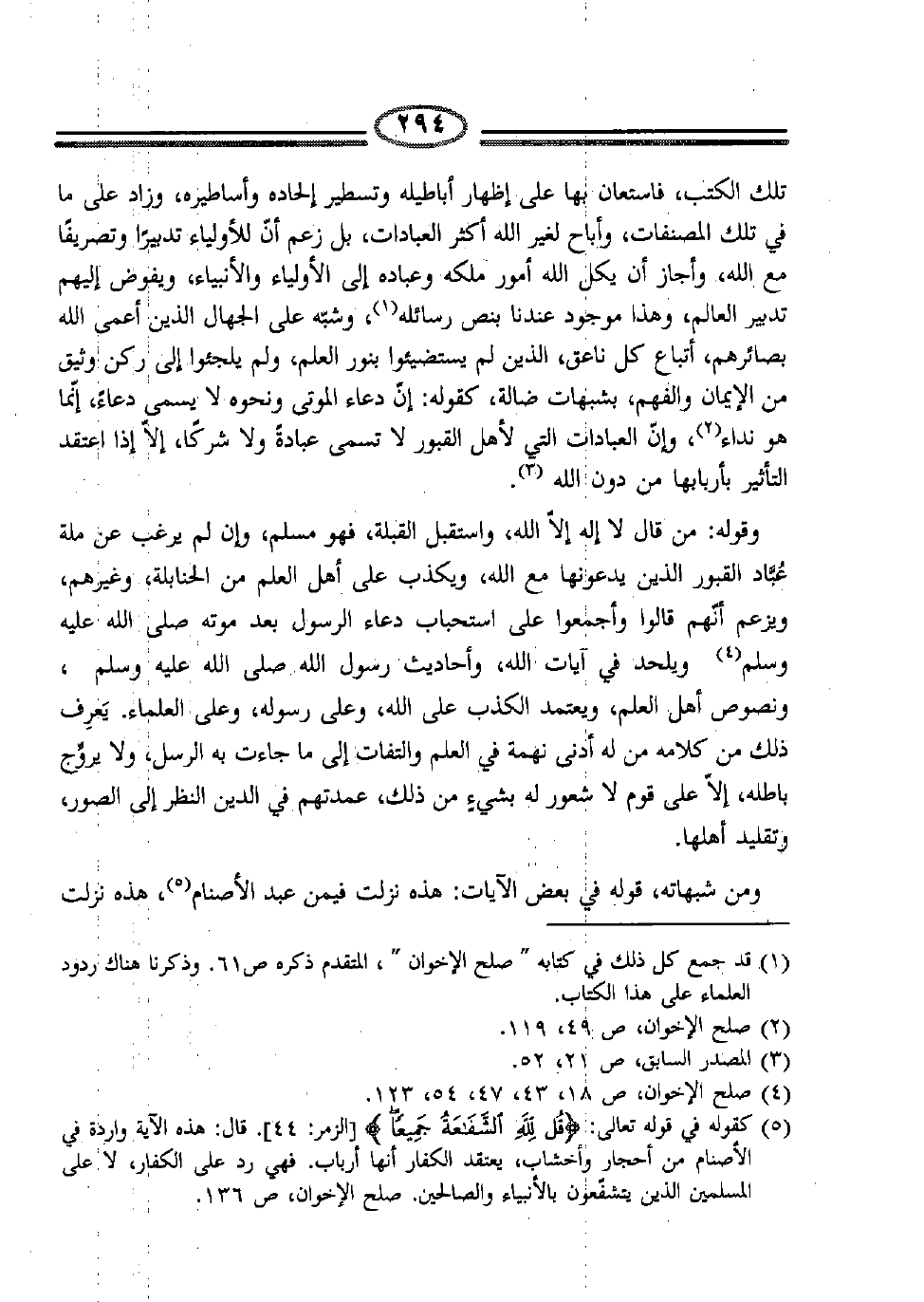 (5) كقوله تعالى: {قُلْ لِلَّهِ الشَّفَاعَةُ جَمِيعاً} [الزمر:44] ، قال هذه الآية واردة في الأصنام من أحجار وأخشاب، يعتقد الكفار أنها أرباب، فهي رد على الكفار، لا على المسلمين الذين يتشفّعون بالأنبياء والصالحين. صلح الإخوان ص136.