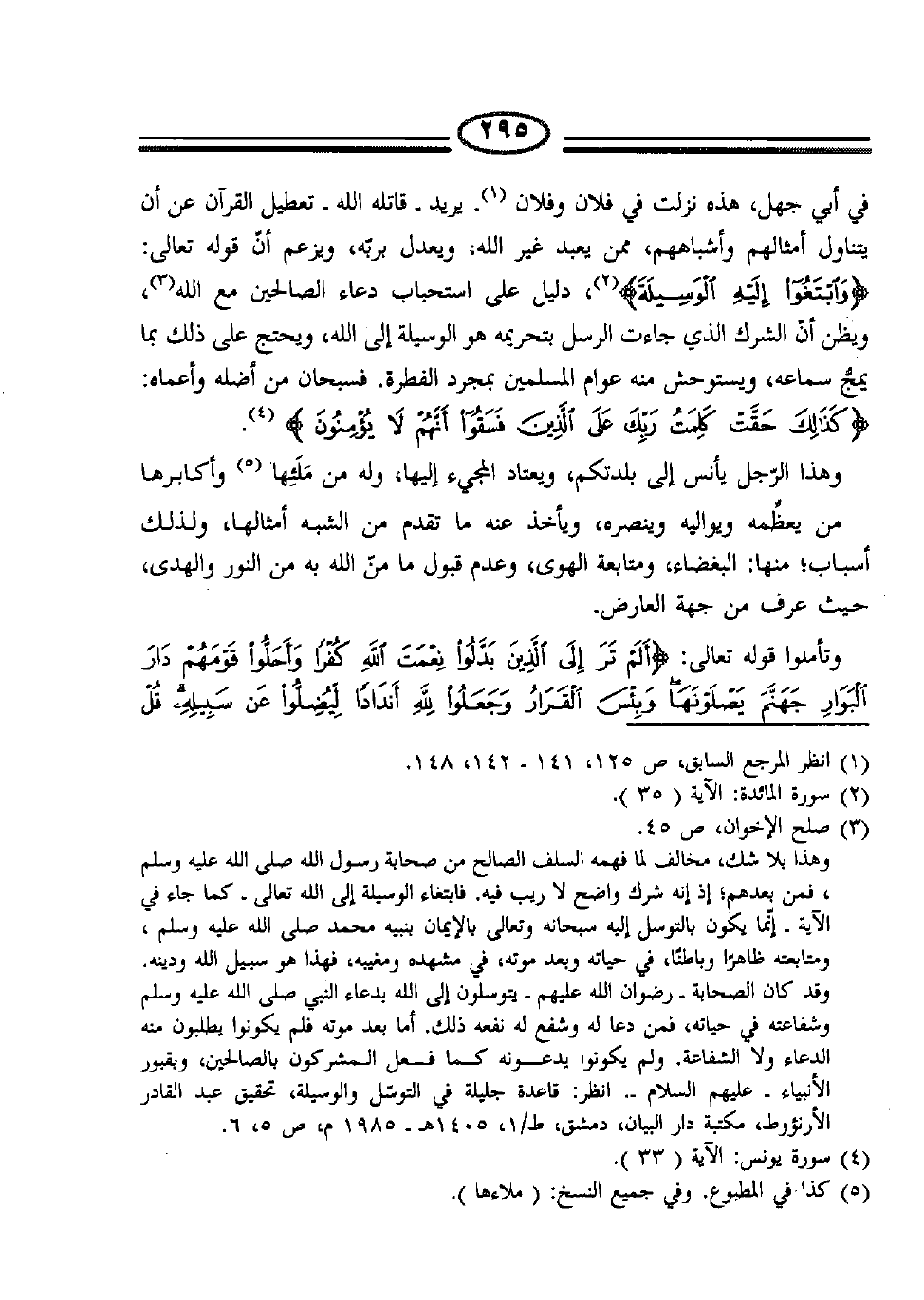 في أبي جهل، هذه نزلت في فلان وفلان (1) ، يريد –قاتله الله- تعطيل القرآن عن أن يتناول أمثالهم وأشباههم، ممن يعبد غير الله، ويعدل بريه، ويزعم أن قوله تعالى: {وَابْتَغُوا إِلَيْهِ الْوَسِيلَةَ} (2) ، دليل على استحباب دعاء الصالحين مع الله (3) ، ويظن إن الشرك الذي جاءت الرسل بتحريمه هو الوسيلة إلى الله، ويحتج على ذلك بما يمجُّ سماعه، ويستوحش منه عوام المسلمين بمجرد الفطرة، فسبحان من أضله وأعماه: {كَذَلِكَ حَقَّتْ كَلِمَتُ رَبِّكَ عَلَى الَّذِينَ فَسَقُوا أَنَّهُمْ لا يُؤْمِنُونَ} (4) .