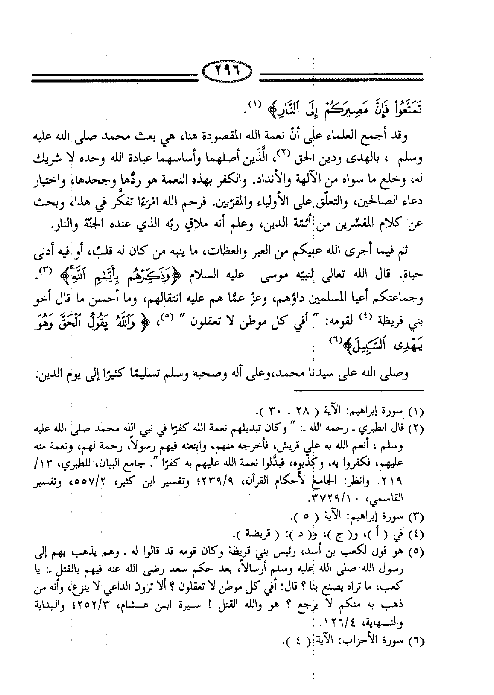 (2) قال الطبري –رحمه الله-: "وكان تبديلهم نعمة الله كفراً في نبي الله محمد صلّى الله عليه وسلّم، أنعم الله به على قريش، فأخرجه منهم، وابتعثه فيهم رسولاً، رحمة لهم، ونعمة منه عليهم، فكفروا به، وكّبوه، فبدّلوا نعمة الله عليهم به كفراً". جامع البيان للطبري، 13/219. وانظر الجامع لأحكام القرآن، 9/239؛ وتفسير ابن كثير 2/557. وتفسير القاسمي 10/3729.